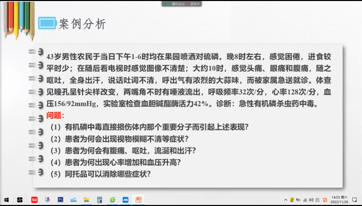 本次公开课主要围绕“神经元之间的功能联系”展开。(1)课前准备阶段:①学生自主利用课余时间在学习通上观看教学视频并进行章节训练;②分小组认领案例分析任务,并制作PPT。(2)课堂阶段:席丽老师首先对本小节的重难点内容进行精讲、细讲;其次对章节训练中错误率高的题目进行详细讲解,使学生不仅做到“知其然”,还要做到“知其所以然”;随后,由任务认领小组对“农民喷施有机磷农药导致中毒后,出现毒蕈碱样症状、烟碱样症状及临床使用阿托品进行解毒”这一案例进行分析和讨论;最后席丽老师对各小组分析过程和讨论结果进行补充和评价。通过以学生为主导,以重难点精讲+案例分析为主要教学方法,使学生掌握各知识点之间的内在联系,并学会用已学的知识解决新的问题,从而提高运用知识的能力。