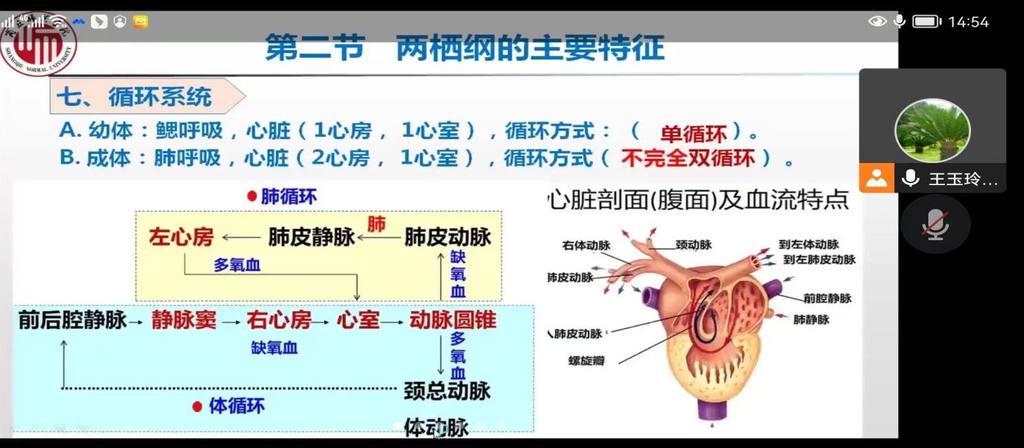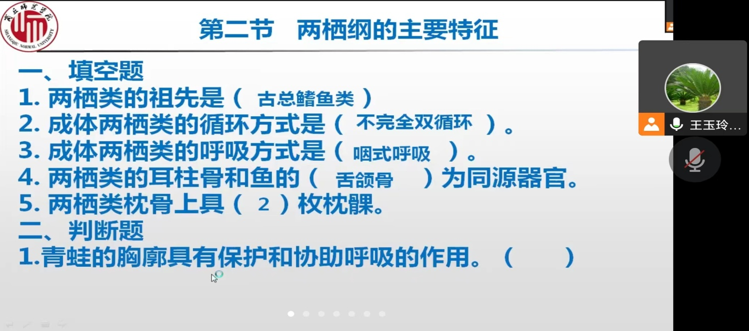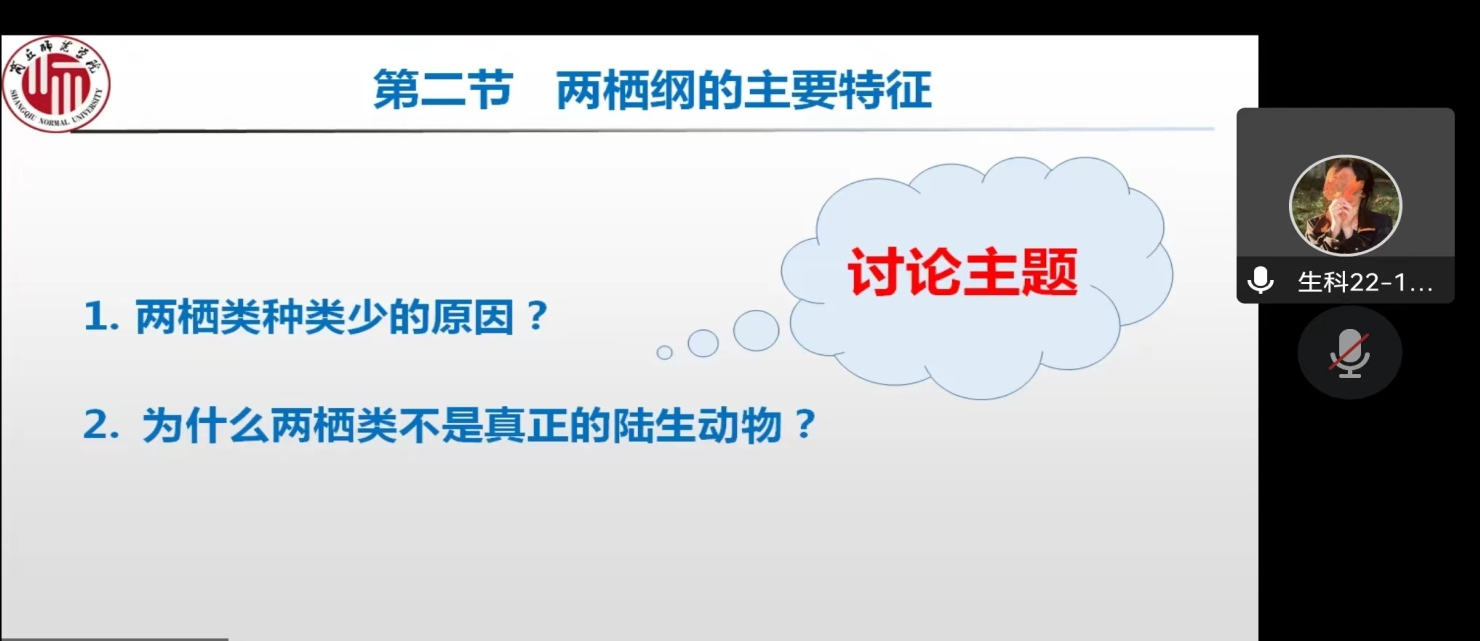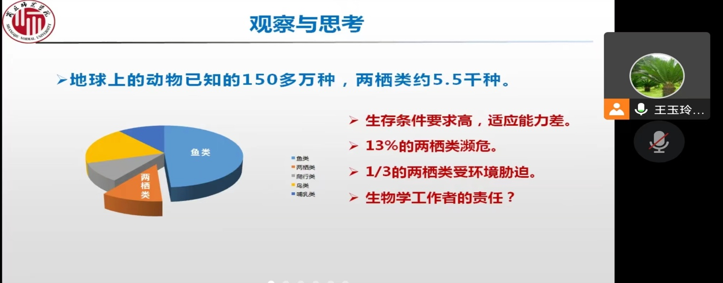 本次公开课讲授的是‘两栖纲的主要特征’, 依据“线上知识学习,线下能力提升”的改革理念,老师提前一周,通过‘学习通’给学生发布学习任务,要求学生提前线上学习,并要求学生把线上学习时遇到的问题记录下来,带着问题来到课堂。课程开始,王玉玲老师首先对学生线上所学知识进行了复习巩固,根据学生对问题的回答情况,再有针对性地进行讲解和剖析。