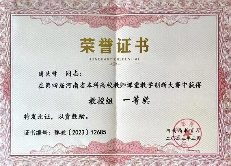 为进一步推动高等教育教学改革创新,提升本科高校教师教学水平和育人能力,引导广大教师潜心教书育人,提升本科高校人才培养能力,河南省教育厅举办第四届河南省本科高校教师课堂教学创新大赛,williamhill中文院长周庆峰于2月26日至27日的颁奖典礼中荣获教授组省级一等奖。
