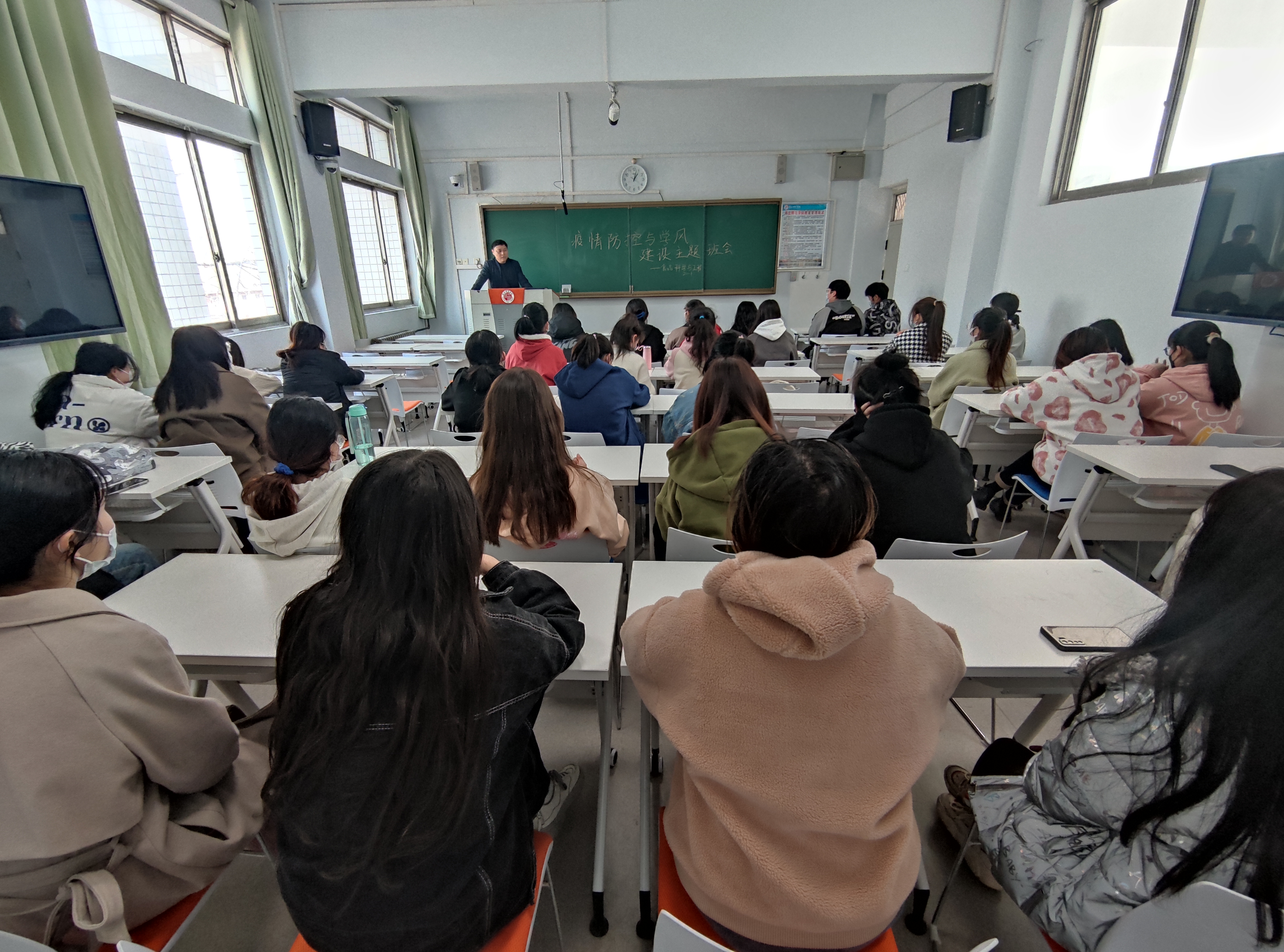 首先,李大虎与同学们讨论了英语四级等考试情况,强调此类考试的重要性。接着,老师对同学们近期的学习情况进行更加详细地分析,引导同学们拥有正确的学习态度,希望同学们能努力学习,为自己的未来进行合理的规划。最后,全班同学针对疫情防控方面进行了积极讨论,大家踊跃发言,表达了对疫情防控的认识与防控过程中的心得体会。李大虎强调,现在正是防控疫情的关键阶段,在这个关键的时刻,更不能掉以轻心,应该加强自身科学素养,遵循权威信源的专业建议,践行最合乎理性的防疫办法,而同学们也一致表示会严格按照学校的要求执行。