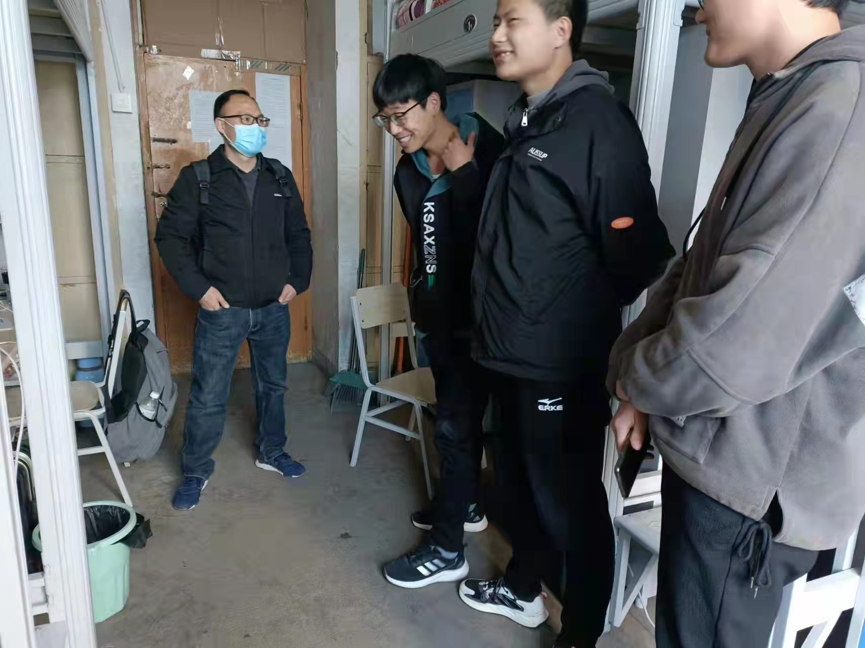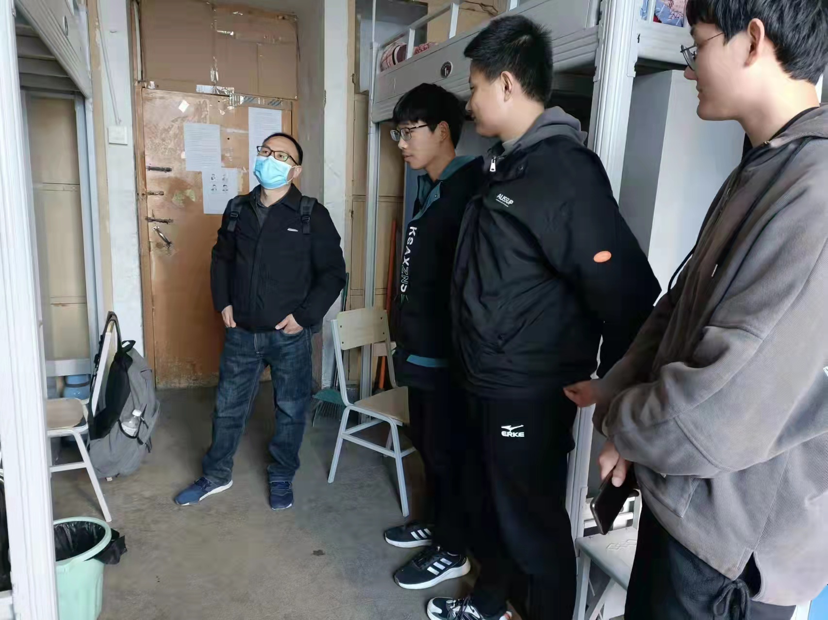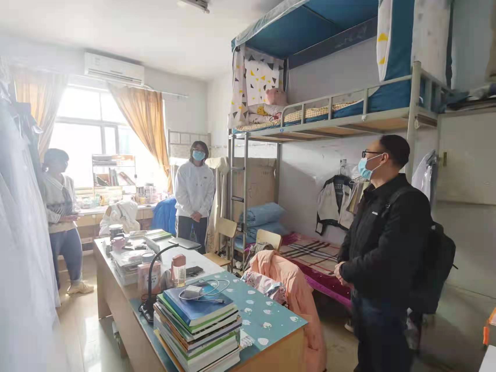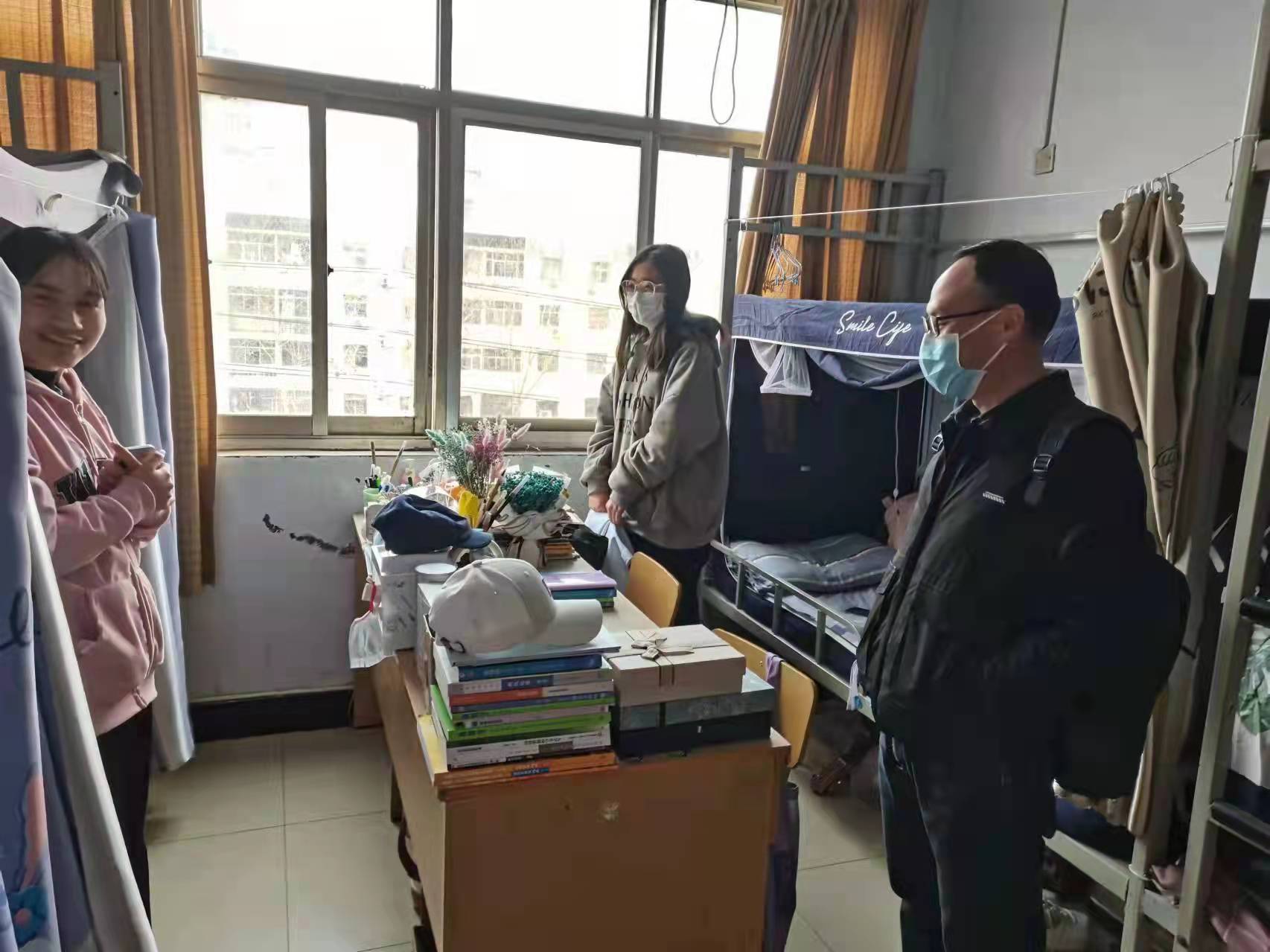 施老师认真检查每一间宿舍,亲切询问同学们的住宿、学习、生活情况,并对学生宿舍进行卫生、用电等方面进行检查。同时向同学们传达了疫情期间学校的防控措施和相关要求。施老师表示,对于同学在学习和生活中遇到的困难,学校领导和老师都会热情地给予帮助。同学们也由衷地感谢施老师对他们的亲切关怀,并一致表示,一定会严格遵守学校疫情防控规定,配合防疫工作。对学生提出的相关问题,施传信老师也尽可能地给他们排疑解惑,并根据自己的经验提出一些生活和学习上的建议。之后,施老师与楼层的宿管阿姨进行了交流,了解宿舍区的管理制度,并表示会积极配合生活管理工作,为增强同学们的安全意识,保持良好的宿舍卫生和纪律而共同努力。最后,施老师表示希望和同学们齐心协力,营造一个健康和谐的住宿环境。