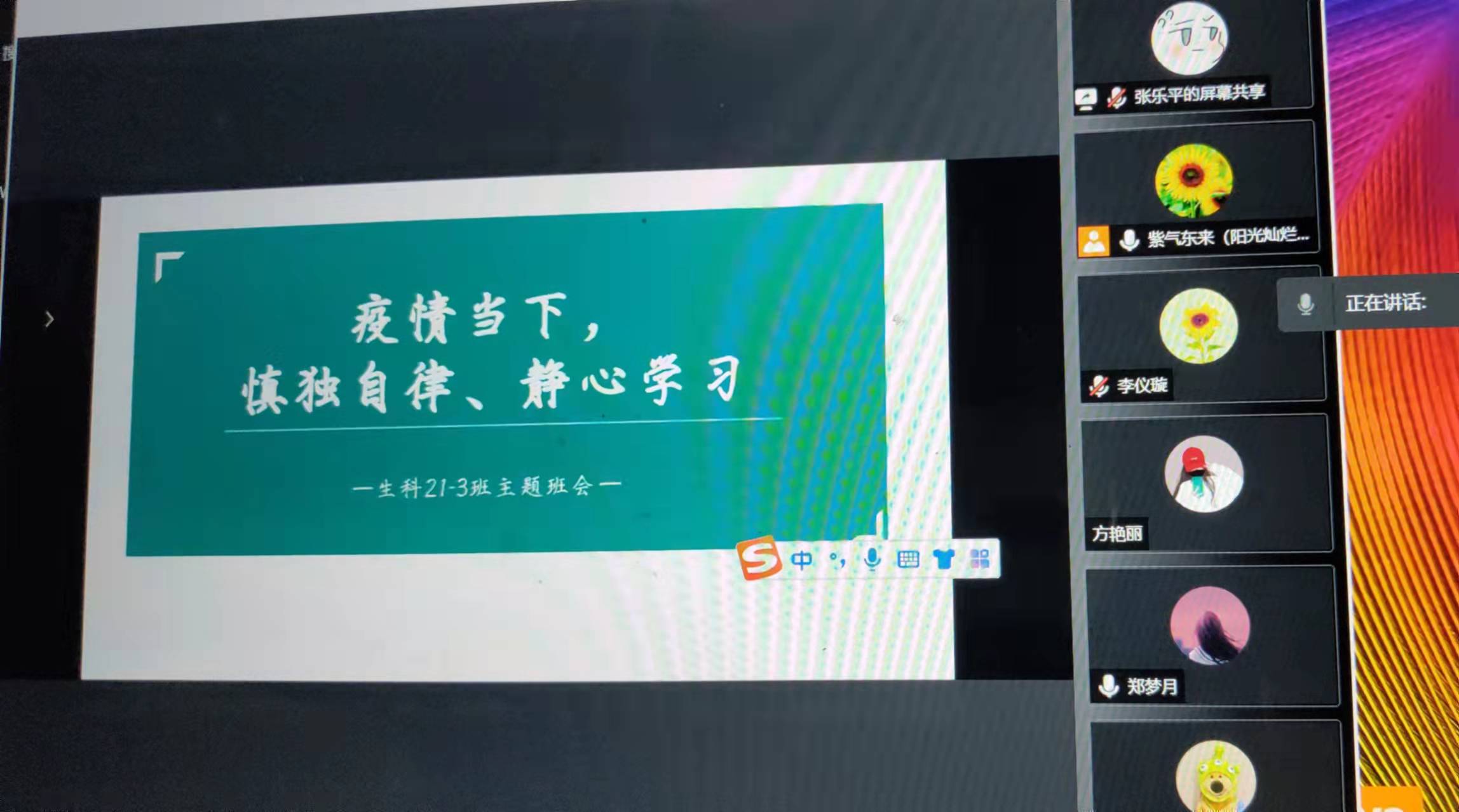为了落实新冠肺炎疫情防控的工作,增强同学们的疫情防控意识,使同学们在学校新型冠状肺炎疫情防控期间的生活更加安全有序舒心,williamhill中文2021级生物科学3班于3月18号下午召开主题为“疫情当下,慎独自律,静心学习”的线上班会。