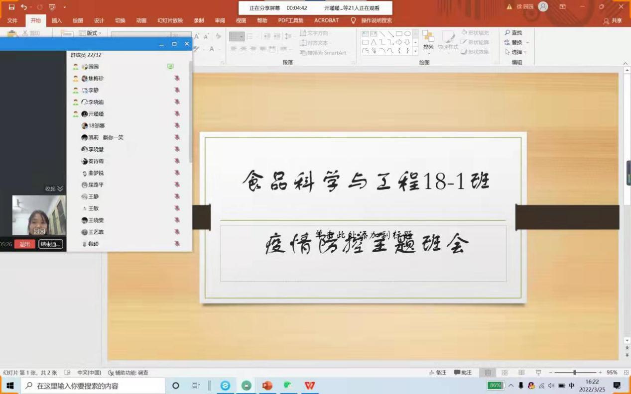 为了进一步落实好williamhill中文疫情防控工作,使同学们对当前疫情形势有深刻的了解,切实提高同学们的安全意识,帮助同学们更好地掌握疫情防控知识,williamhill中文2018级食品科学与工程专业1班班主任徐园园于2022年3月25日召开疫情防控主题班会。