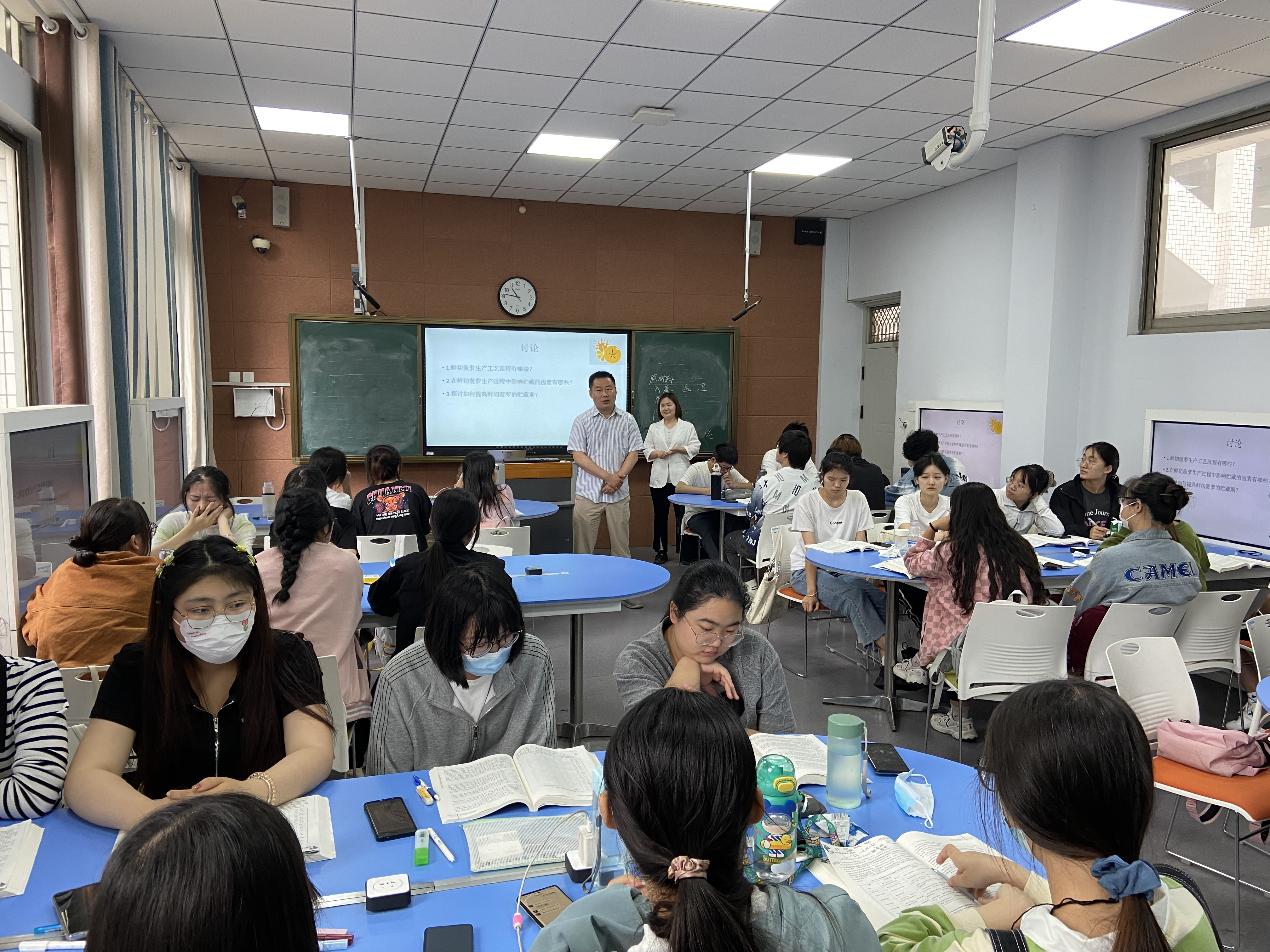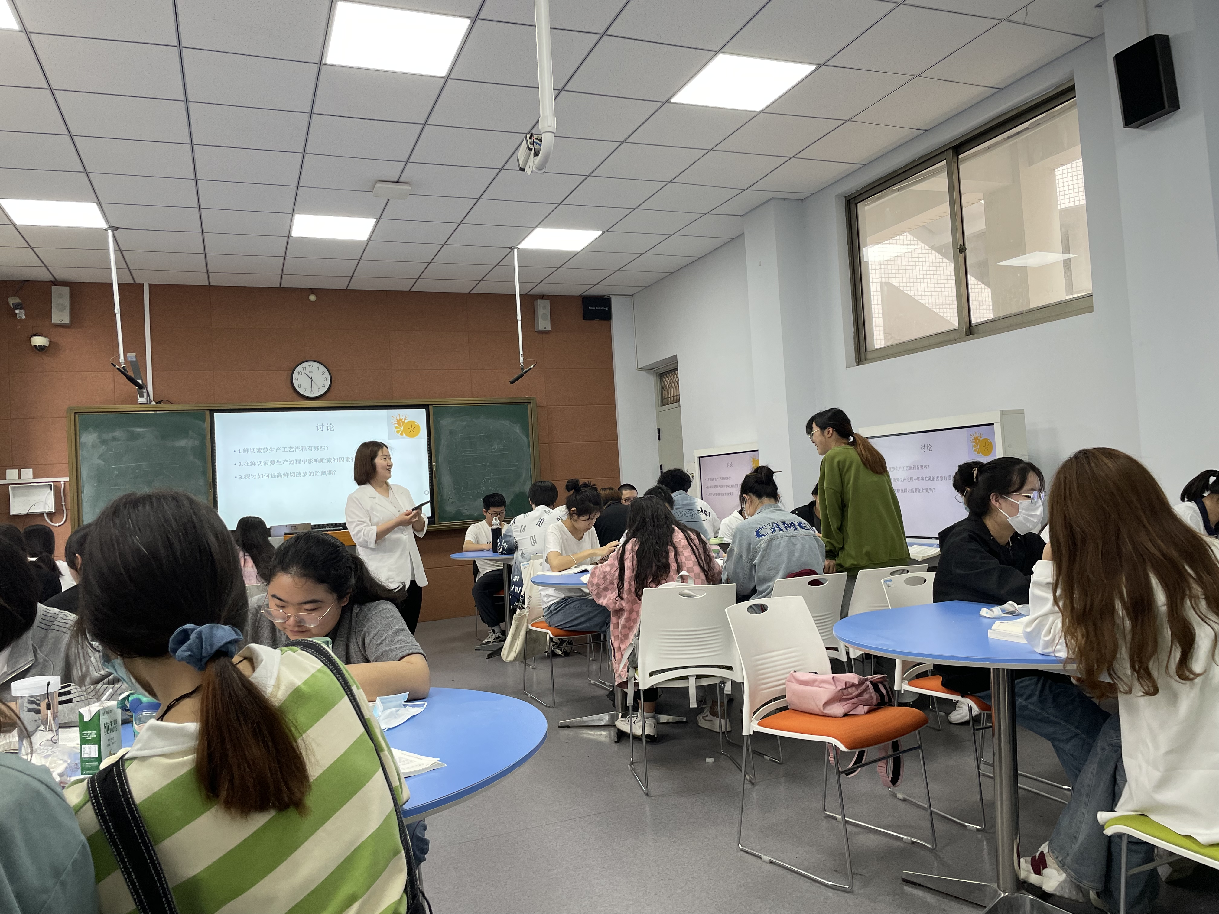 本次公开课,徐园园老师选择《鲜活和生鲜食品贮藏保鲜》章节的“鲜切果蔬的贮藏”专题作为主要讲解内容。课程采用“线上线下相结合的”授课模式进行。线上教学利用超星泛雅平台进行课程的基础知识的讲授,线下课程采用“案例教学法”授课。课堂教学过程包括“线上教学内容回顾——线上教学重点内容提问——案例观看——分组讨论——课堂总结”5个流程。徐园园老师通过《鲜切菠萝加工工艺》视频案例引导学生对“鲜切水果的加工工艺流程”、“影响鲜切水果的贮藏因素”和“提高鲜切水果贮藏期的方法”三个问题展开讨论。同学们发言积极,师生互动良好,课堂氛围生动活泼。