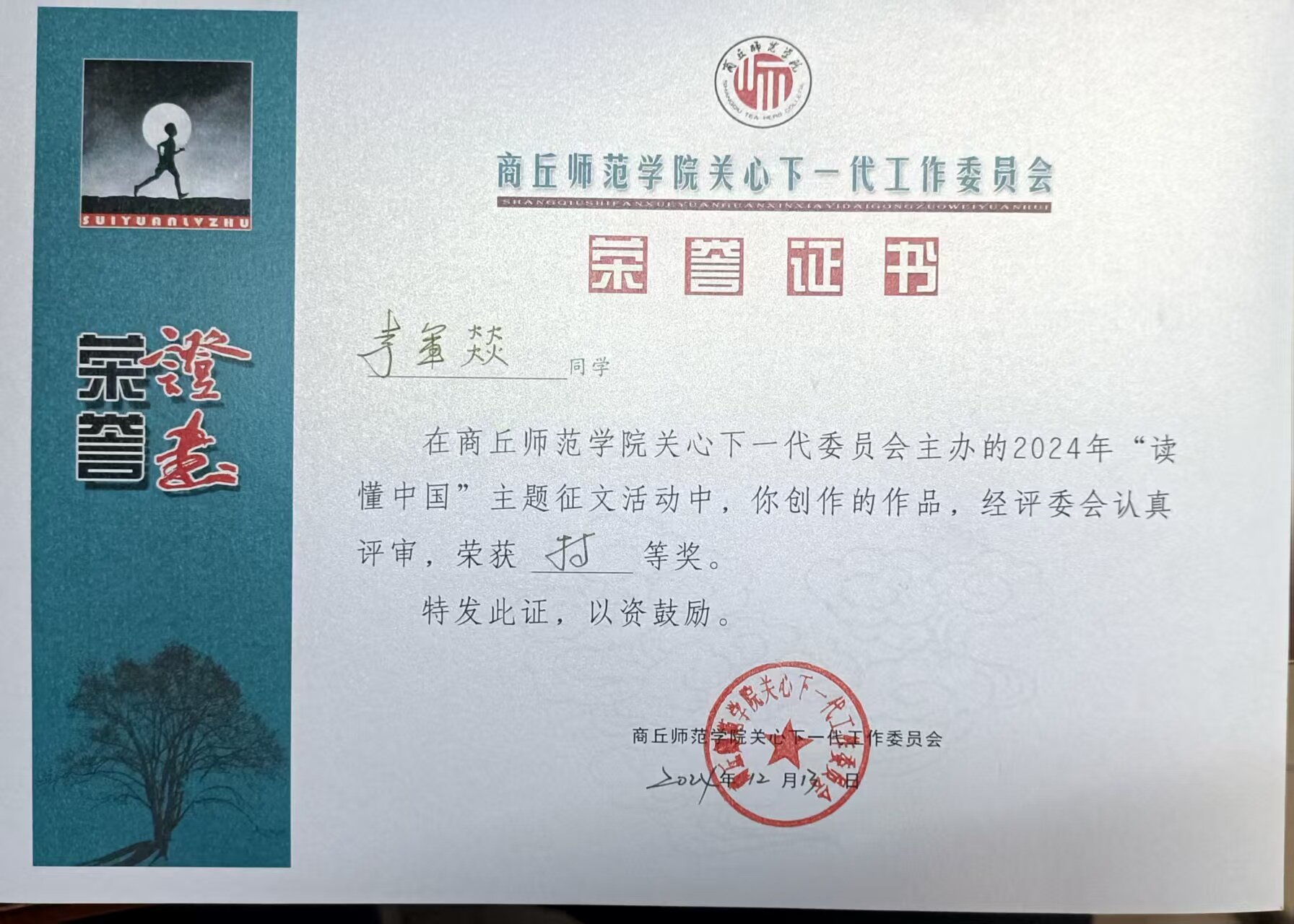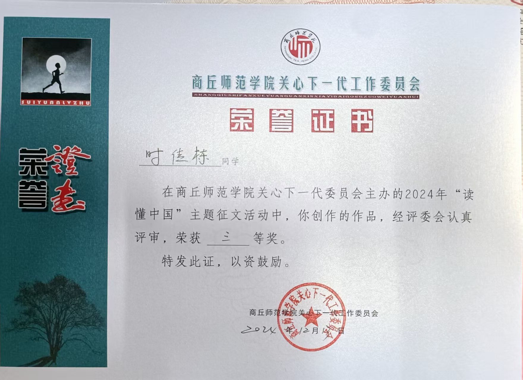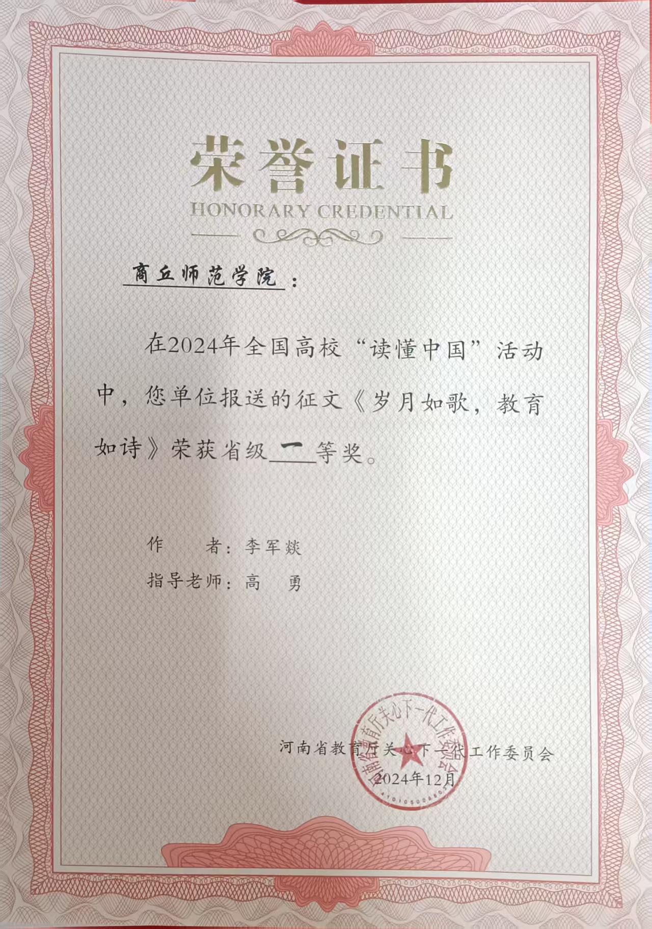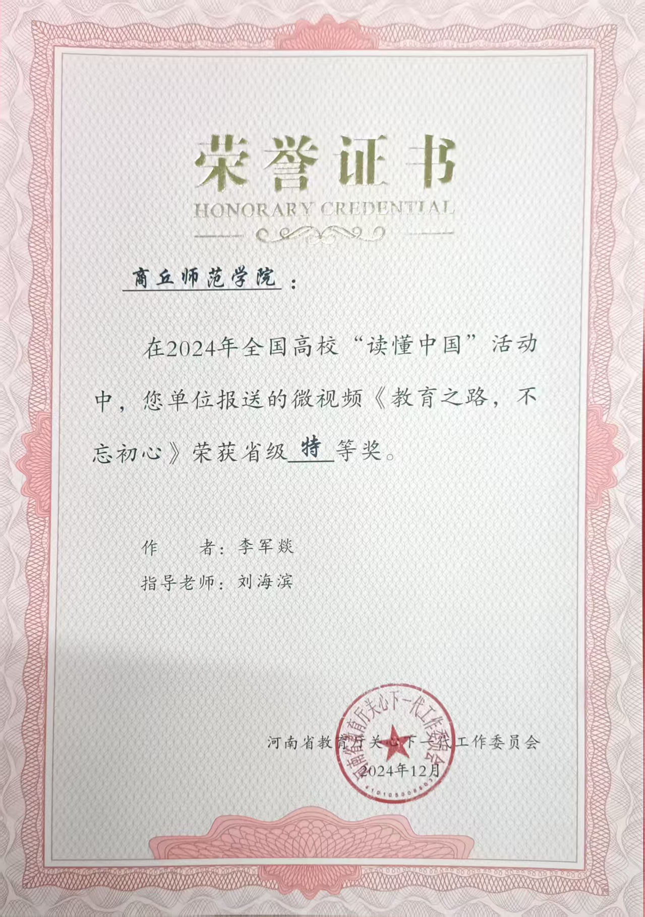 其中,在学院关工委指导下创作的《教育之路,不忘初心》获河南省微视频组特等奖;学生李军燚撰写的作品《岁月如歌,教育如诗》获河南省征文组一等奖。同时,微视频《教育之路,不忘初心》获得了2024年威廉官网中国“读懂中国”活动微视频类一等奖,征文《岁月如歌,教育如诗》2024年威廉官网中国“读懂中国”活动征文特等奖,征文《矢志不渝,薪火相传》获得征文三等奖。