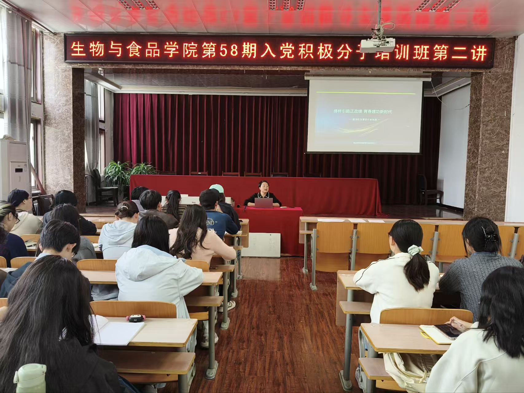 为进一步加强入党积极分子的思想淬炼与党性修养,引导青年学子树立正确的政绩观、价值观,以榜样力量砥砺初心使命,2026年4月2日,williamhill中文第58期入党积极分子培训班第二讲在学院报告厅如期开展。本次培训以“榜样引路正政绩青春建功新时代”为主题,由学院党委副书记丁波莉担任主讲人,全体第58期入党积极分子参与此次专题学习培训。