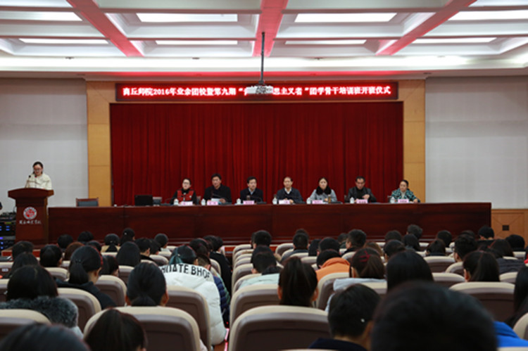 为深入学习习近平总书记关于加强群团工作会议和在全国高校思想政治工作会议上的重要讲话精神,贯彻落实团中央《“青年马克思主义者培养工程”实施纲要》精神,全面提高我校广大共青团干部的理论水平和思想政治素质,以适应新时期共青团工作的发展要求。12月23日下午,我校2016年业余团校暨第九期“青年马克思主义者”团学骨干培训班在平原路校区一号行政楼113会议室举行开班仪式。校党委书记介晓磊,党委副书记陈中亚,副校长陈向炜出席了开班仪式。校党委组织部、宣传部、学工部、团委等有关单位负责人,各学院主抓团学工作的党总支副书记(书记)以及学员代表参加了开班仪式。开班仪式由党委副书记陈中亚主持。