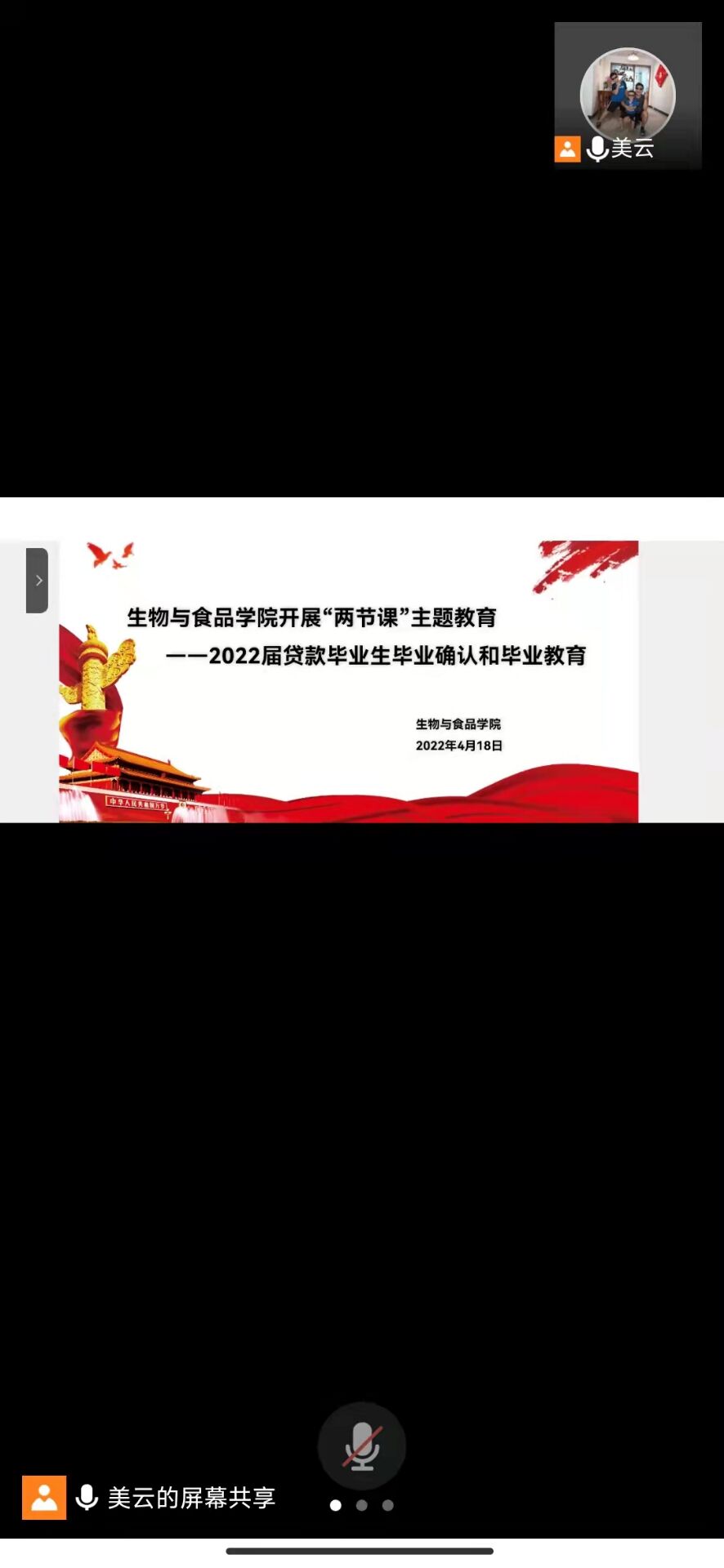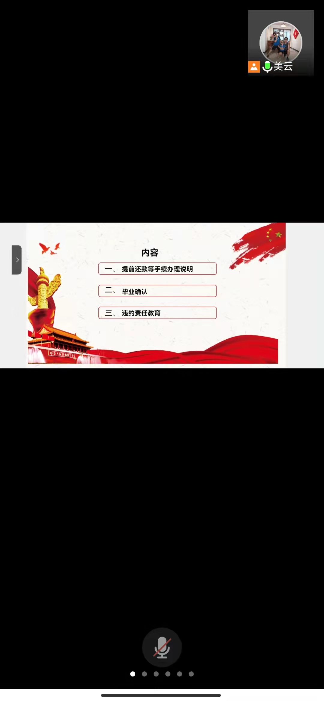 为进一步加强贷后管理工作,帮助毕业生充分认识了解助学贷款的还款流程,确保2022届贷款毕业生离校前、后办理助学贷款相关手续的顺利进行,williamhill中文于2022年4月18日在线上召开了2022届贷款毕业生进行毕业确认以及毕业教育会议。本次会议由我院2022届毕业班辅导员张美芸主持,我院2022届全体贷款毕业生参加此次会议。