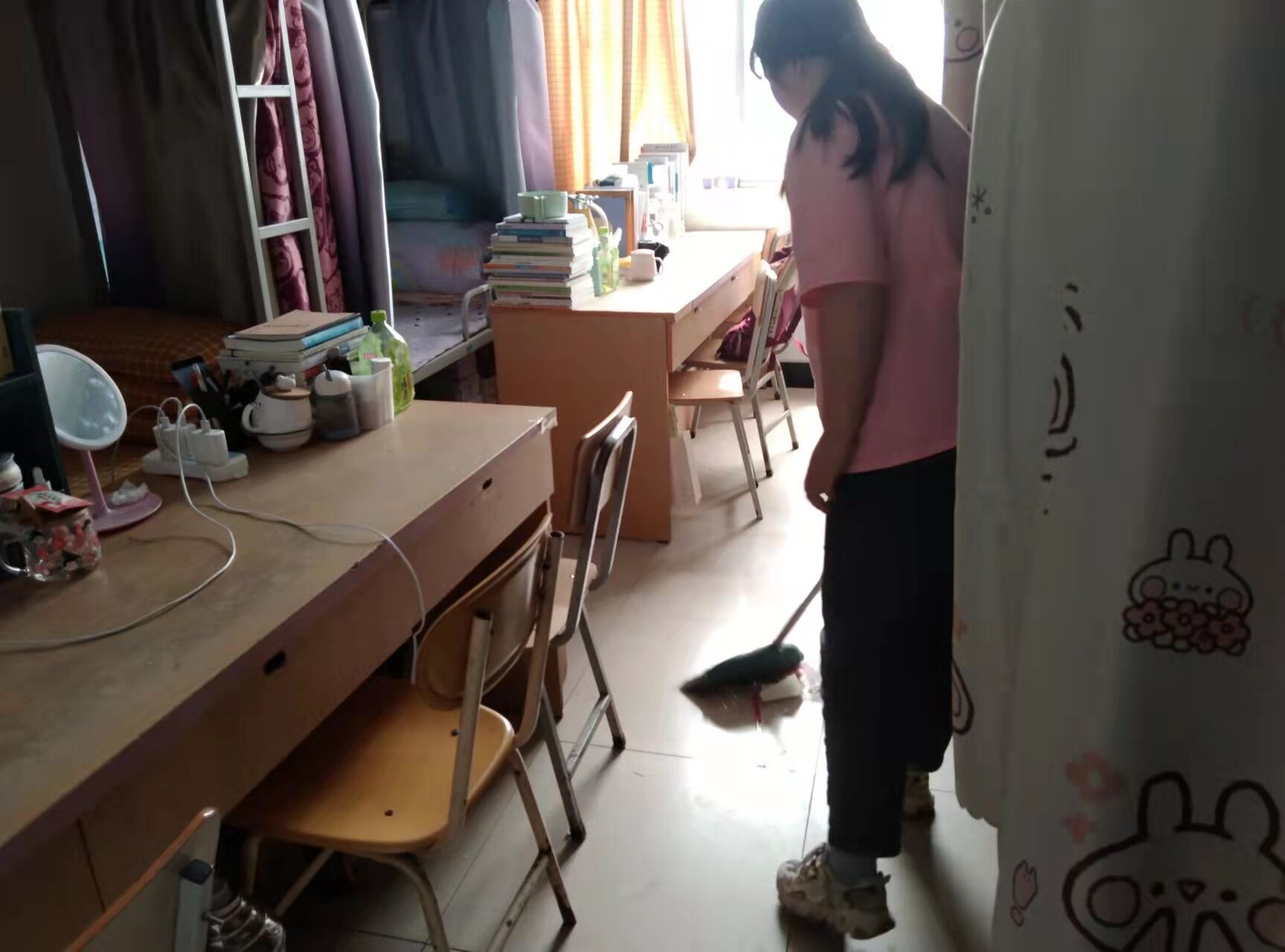 宿舍卫生检查之前,我院学生积极投身于对宿舍卫生的清扫,打扫宿舍地面、拖地、整理摆放书本及生活用品。各宿舍成员间相互配合,分工明确,有序开展打扫工作,原本整洁明亮的宿舍在同学们清扫之后更加舒适温馨。在看到宿舍面貌焕然一新后,同学们深深感受到了劳动的不易也收获了劳动带来的快乐。
