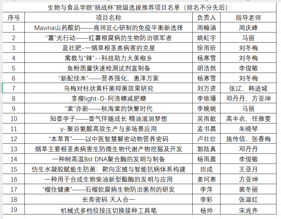 本次“挑战杯”院级选拔赛,共推荐19个项目团队参加校级初审(名单下附)。