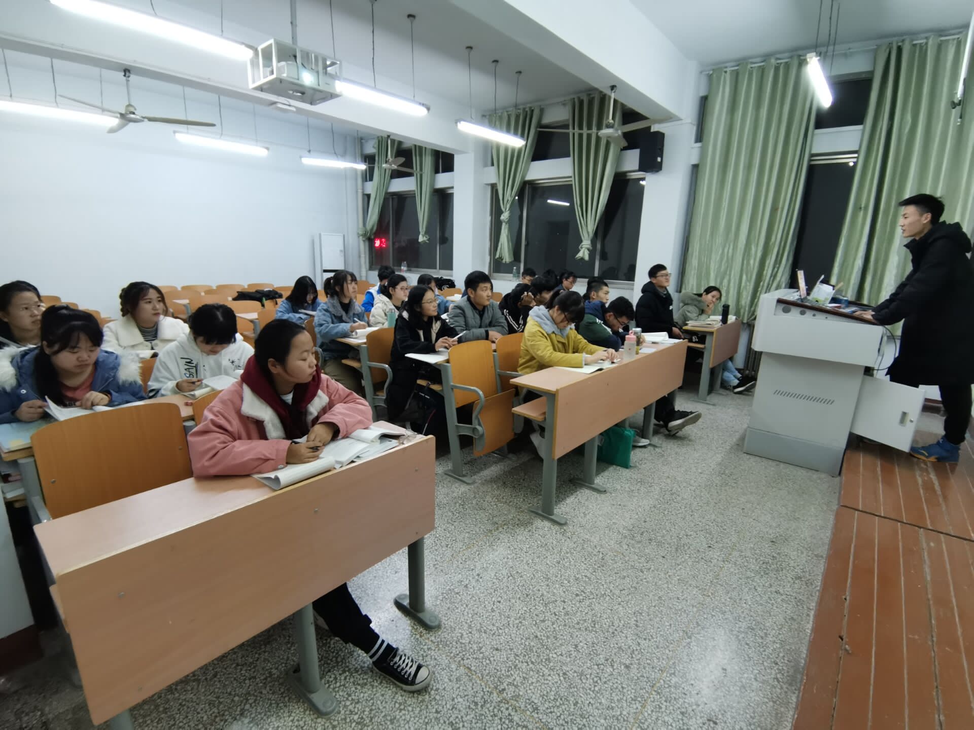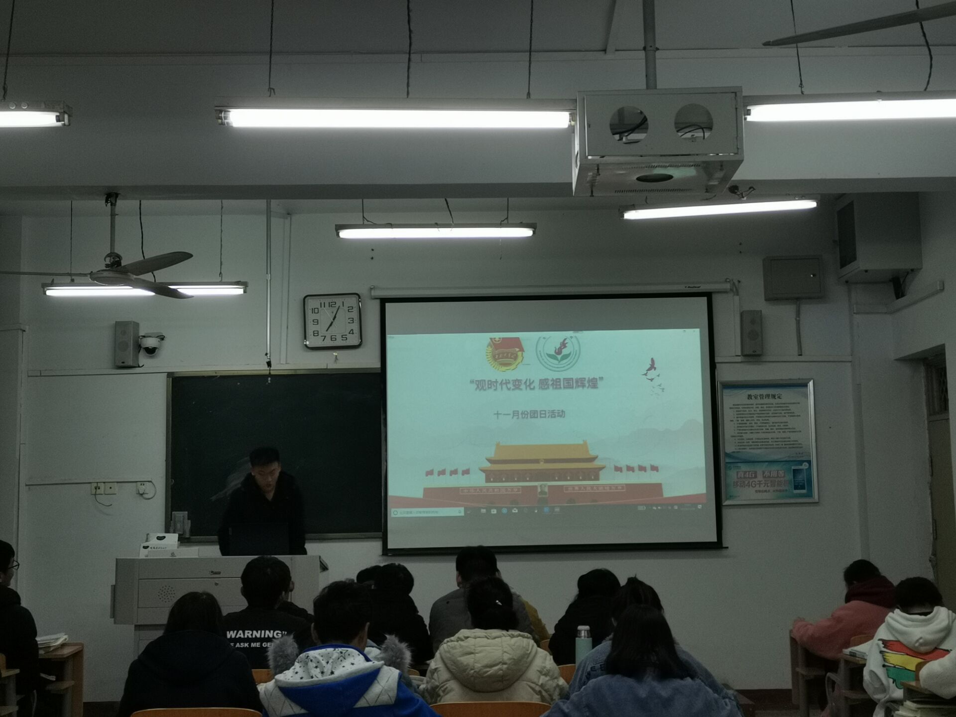 本次活动由团支书刘伟伟同学担任主持。首先,刘伟伟同学向大家讲述了解放初期贫困的中国,过去与现在形成鲜明的对比,让学生们感到了祖国时代的变化与现在的辉煌成就,增强了学生们的民族自豪感。紧接着,刘伟伟同学进行了抽查提问,通过提问同学们如今中国在世界上有哪些辉煌成就,使同学们更加认识和了解现在的中国,感受中华民族对世界的重大贡献,萌发民族自信心,同时也让学生们认识了那些为了祖国繁荣而默默付出的幕后工作者。因为他们的努力,才造就了现在祖国的繁荣。最后,团支书希望每位学生能写一篇关于本次团日活动的心得,浅谈自己的收获与体会。