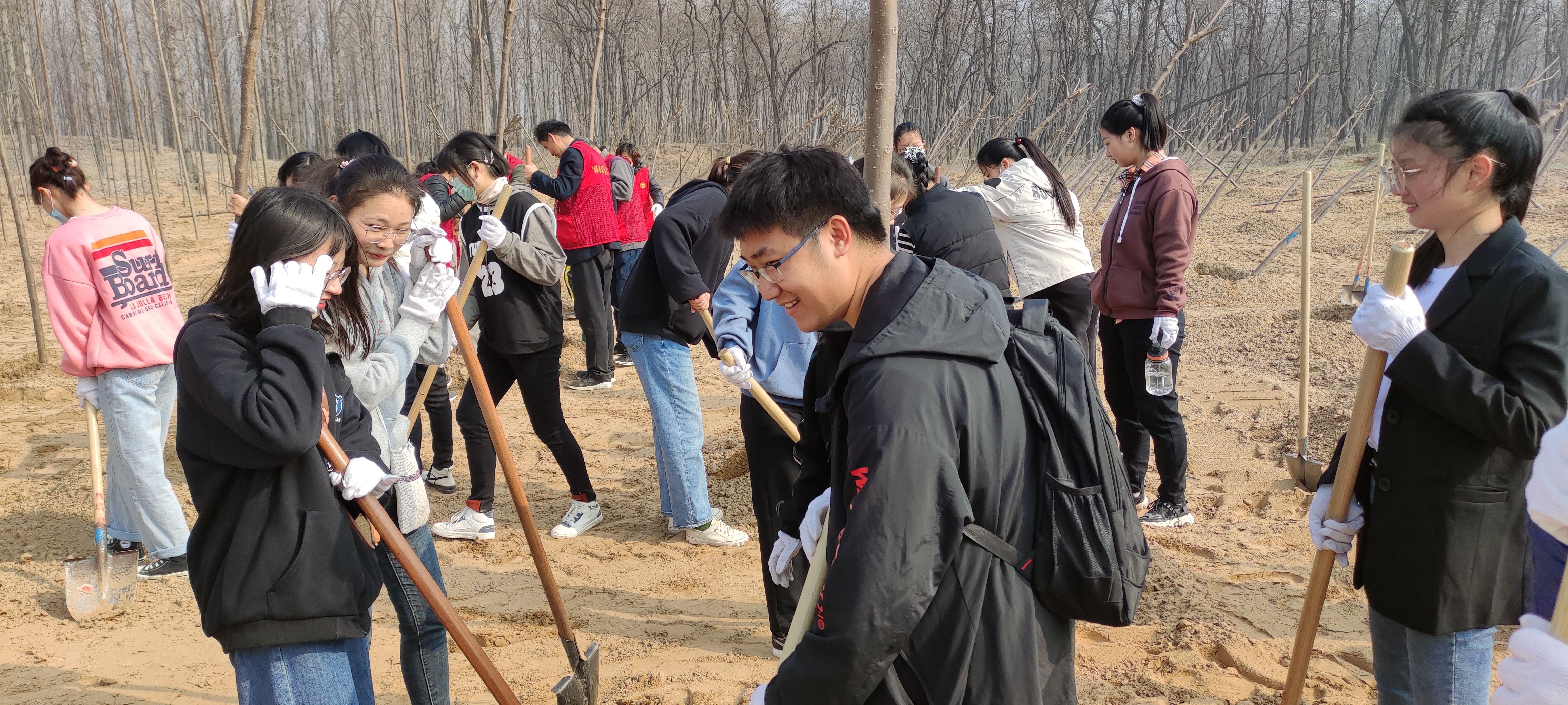本次活动内容主要由公益植树和游览黄河故道国家公园两部分组成。植树之前,黄河故道国家森林公园的领导为老师、同学们讲述了植树的相关要领及注意事项,接着师生们就开始了植树之旅。