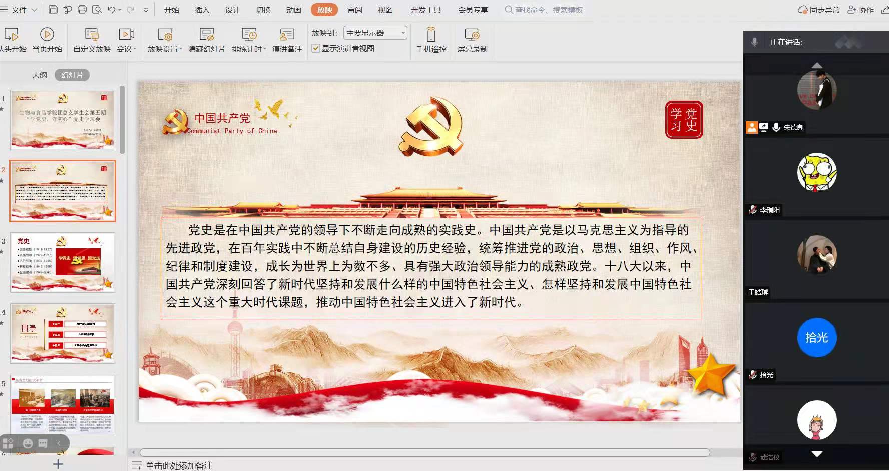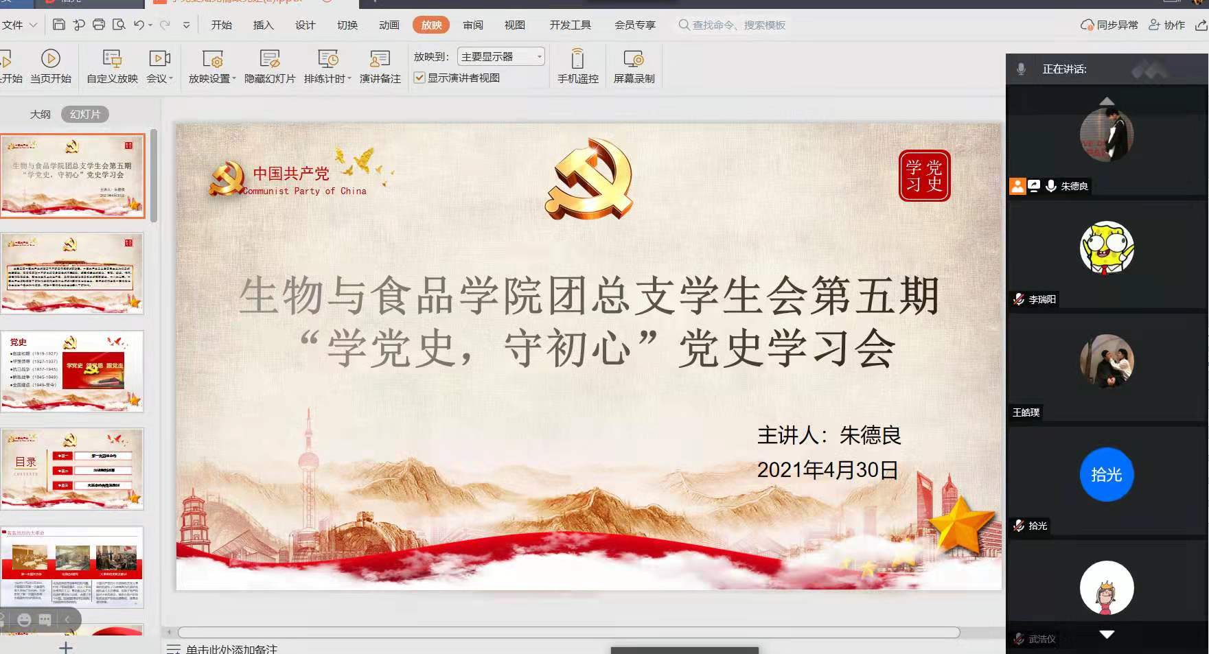 为进一步加强党史学习教育,统筹推进党的作风纪律和制度建设,2021年4月30日,williamhill中文团总支学生会于线上开展第五期“学党史,守初心”党史学习会。此次会议由我院团总支学生会主席朱德良主持,团总支学生会全体成员均参加了此次会议。