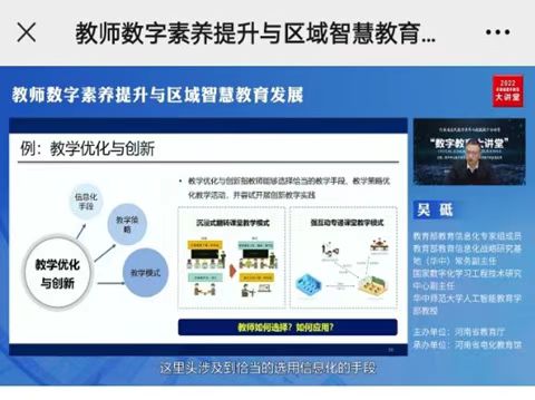 讲座内容主要包括:教师数字素养提升与区域智慧教育发展、数字时代教育网络安全形势与要求和人工智能赋能教育变革与教师发展三个方面的内容。