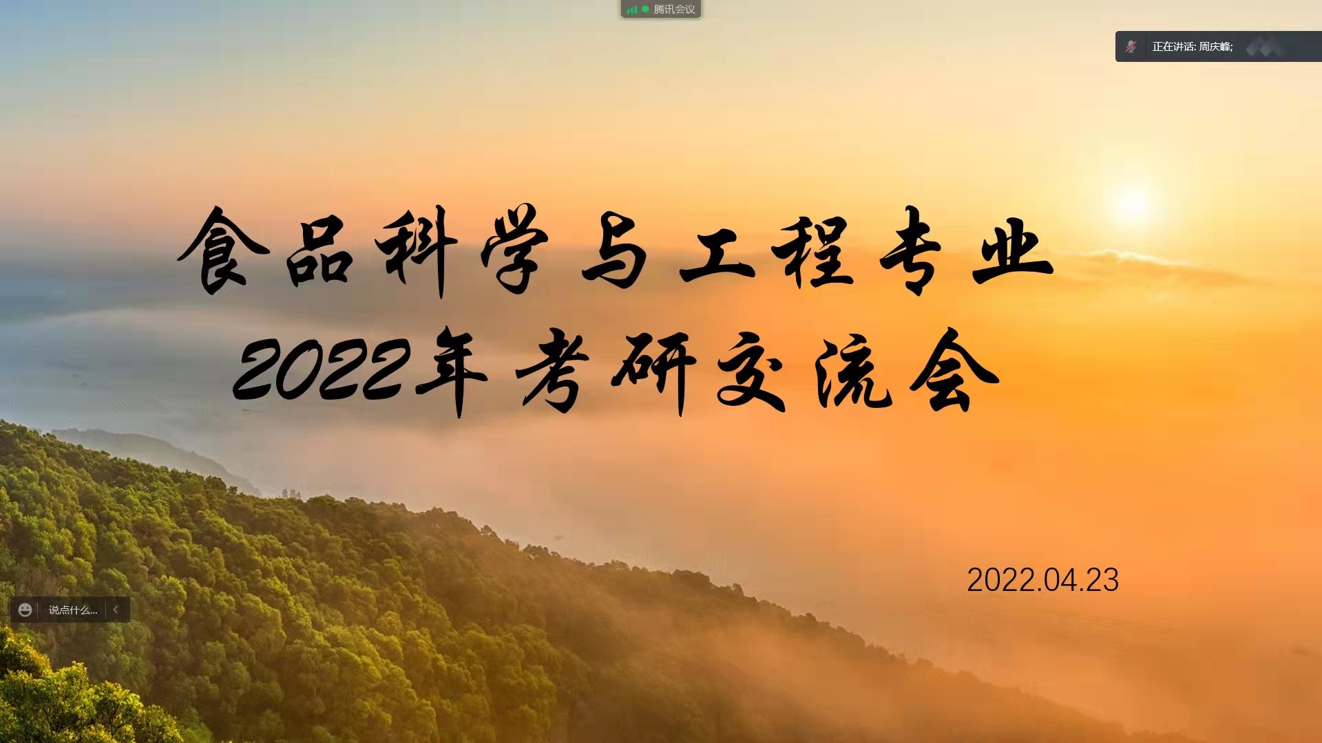 为了进一步提高食品科学与工程专业同学的考研热情,明确考研目标,了解更多考研信息,掌握考研相关技巧,食品科学与工程系于2022年4月23日召开线上考研交流会。本次会议由宋旸老师主持,诚邀williamhill中文院长周庆峰和2022届成绩优异、经验丰富的学长学姐来分享此次考研心得和体会。