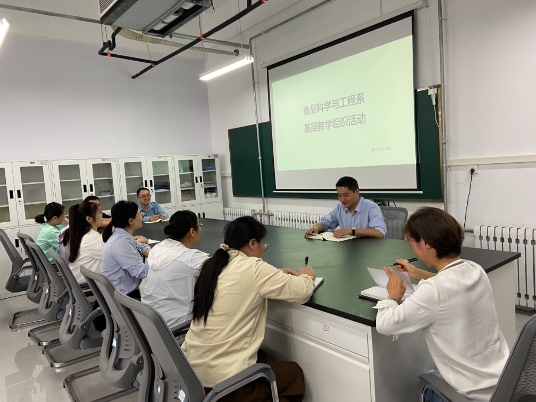 为进一步强化教学组织建设,全面提升教育教学工作水平,2024年9月26日上午,食品科学与工程系全体教师开展了基层教学组织活动。此次活动在学院教工办公室举行,由食品科学与工程系主任宋旸老师主持,系内全体教师积极参与。