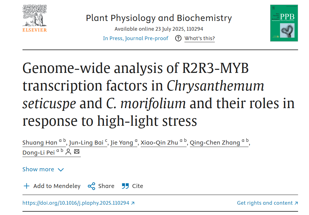 2025年7月24日,威廉官网中国植物与微生物互作团队燧皇种业实验室韩霜教授的最新研究结果:“Genome-wide analysis of R2R3-MYB transcription factors inChrysanthemum seticuspeandC. morifoliumand their roles in response to high-light stress”于Plant Physiology and Biochemistry在线发表。科研团队通过对菊属二倍体甘野菊(Chrysanthemum seticuspe)和六倍体“钟山紫桂”(Chrysanthemum morifolium)的基因组进行深入分析,揭示了R2R3-MYB转录因子家族,特别是第6亚组成员在菊花响应强光胁迫和进化过程中的关键作用。