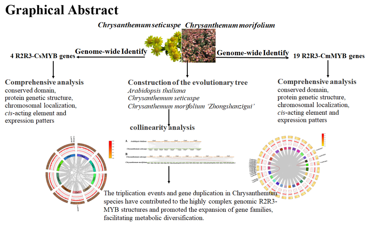 主要结果与结论:鉴定出的CsMYBs和CmMYBs基因是改良菊花耐光性的重要靶点。全基因组三倍化事件(由二倍体向六倍体进化)以及基因重复事件是驱动菊属R2R3-MYB基因家族扩张和结构复杂化的主要动力。
