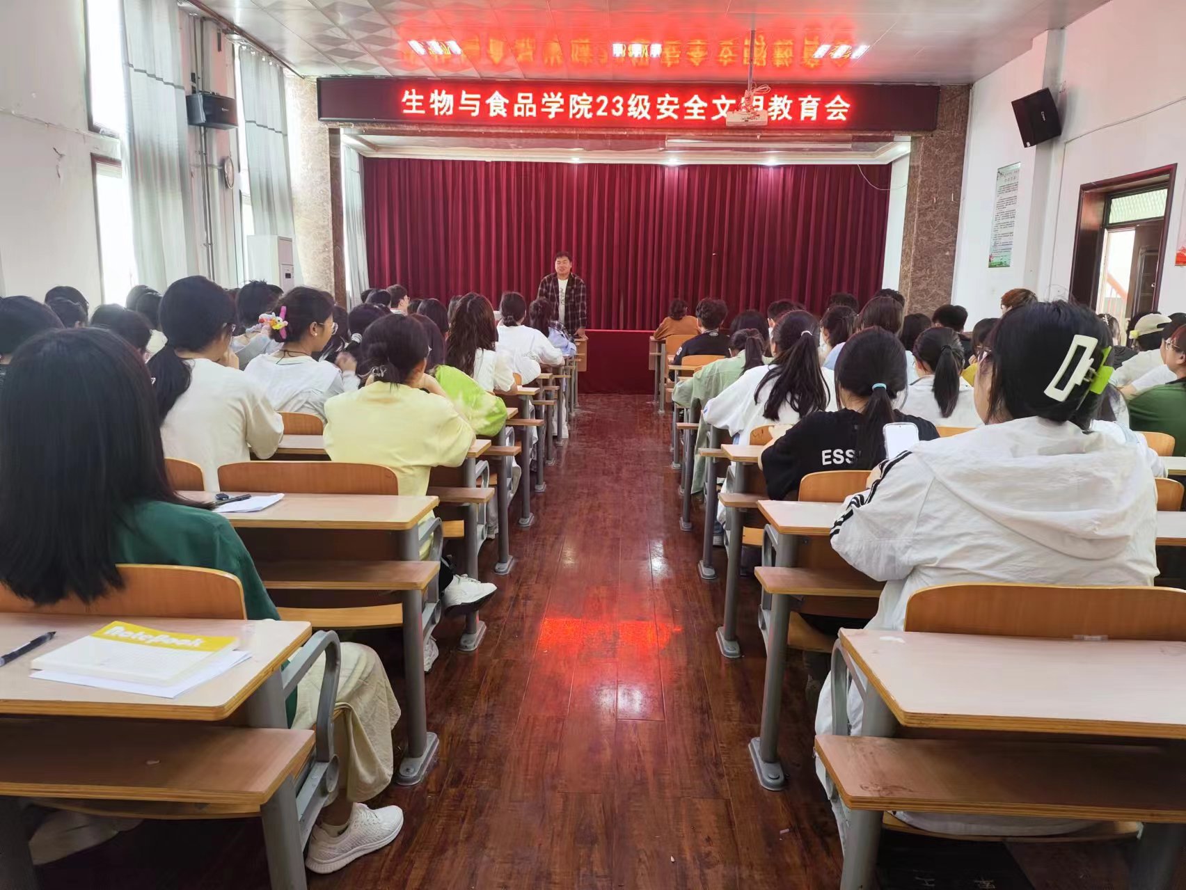辅导员丁蓓老师结合我校安全管理相关文件和典型案例进行教育引导,提醒同学们,牢记安全知识,提升防范意识,保护自身及他人的人身财产安全,为构建平安校园、增进社会和谐贡献力量。
