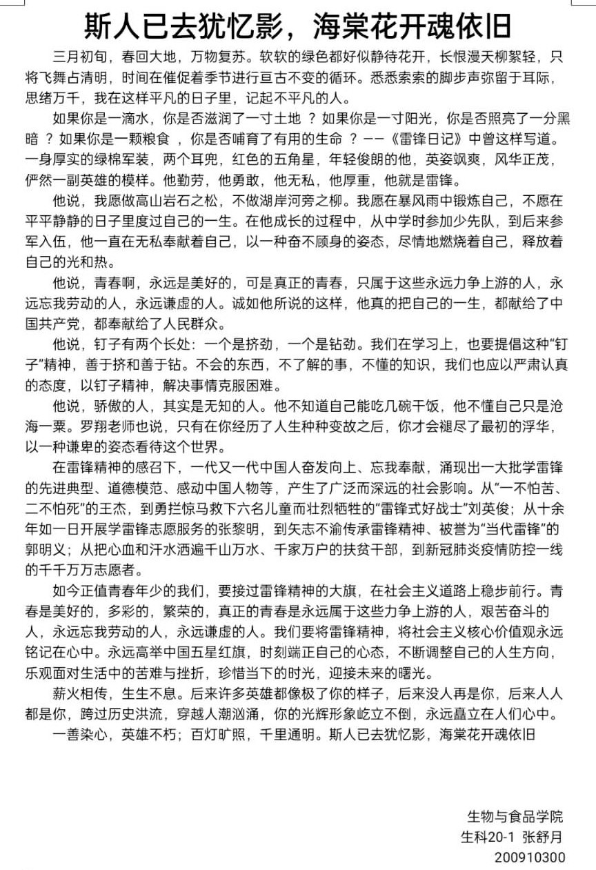 为进一步弘扬“雷锋精神”,不断完善和发展雷锋精神的内涵,落实“安全文明卫生月”工作,倡导助人为乐,无私奉献的精神,营造良好的学习、生活氛围。williamhill中文团委学生会学习部于3月4日举办以“传承雷锋精神,引领青年风尚”为主题的线上征文活动。