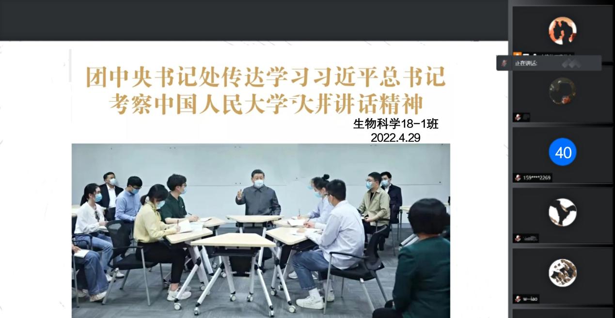 会议伊始,班长首先向大家播放了习近平总书记考察中国人民大学的片段和讲话的视频并向同学们进一步介绍了此次考察的背景和意义。我院2018级各班通过线上形式召开此次班会,各班班长向同学们指出习近平总书记对青年大学生的殷切希望,鼓励大家不负韶华,不负时代,在下一阶段的学习、工作之中始终秉持不忘初心的坚持展现青年风采。