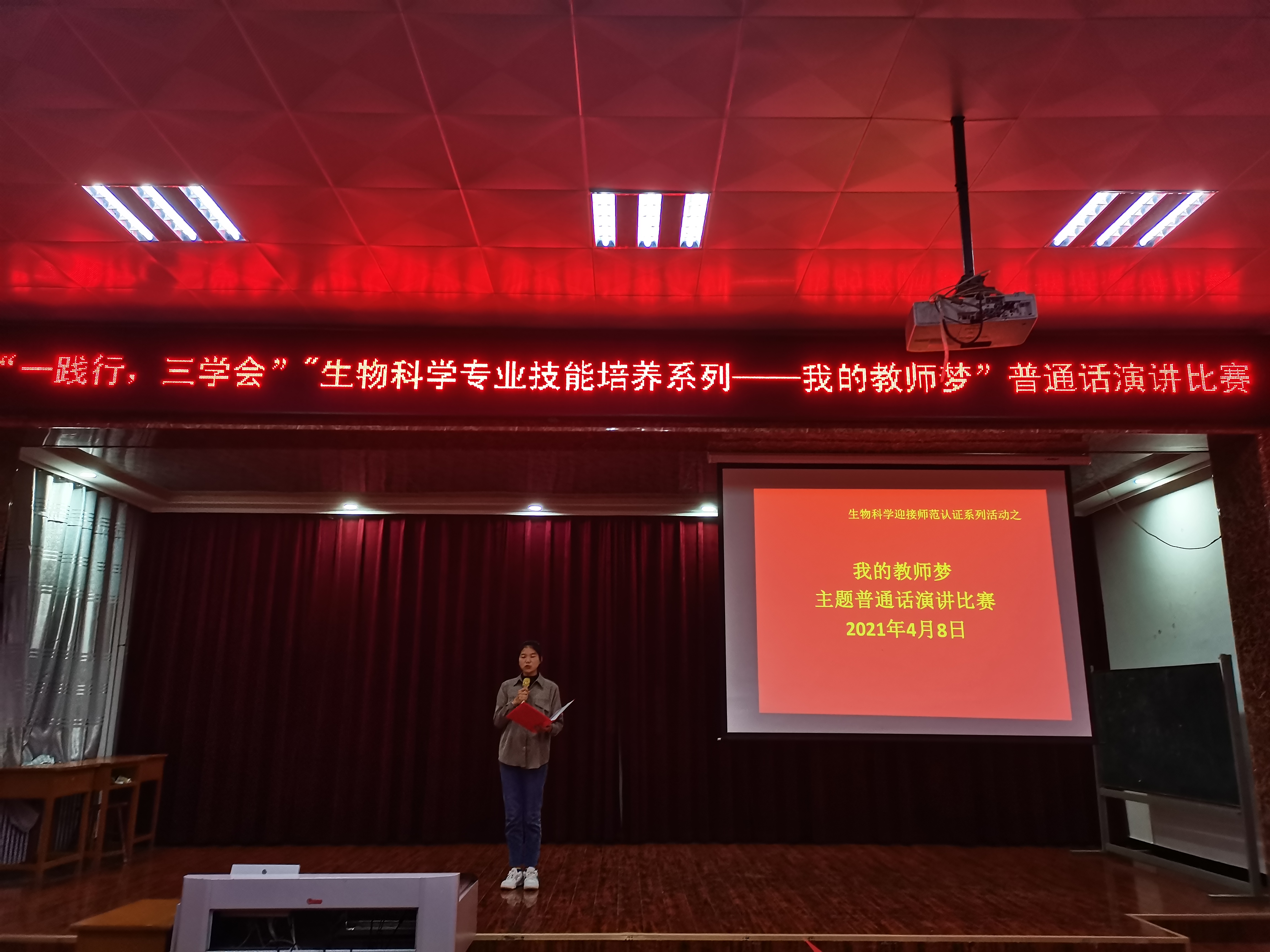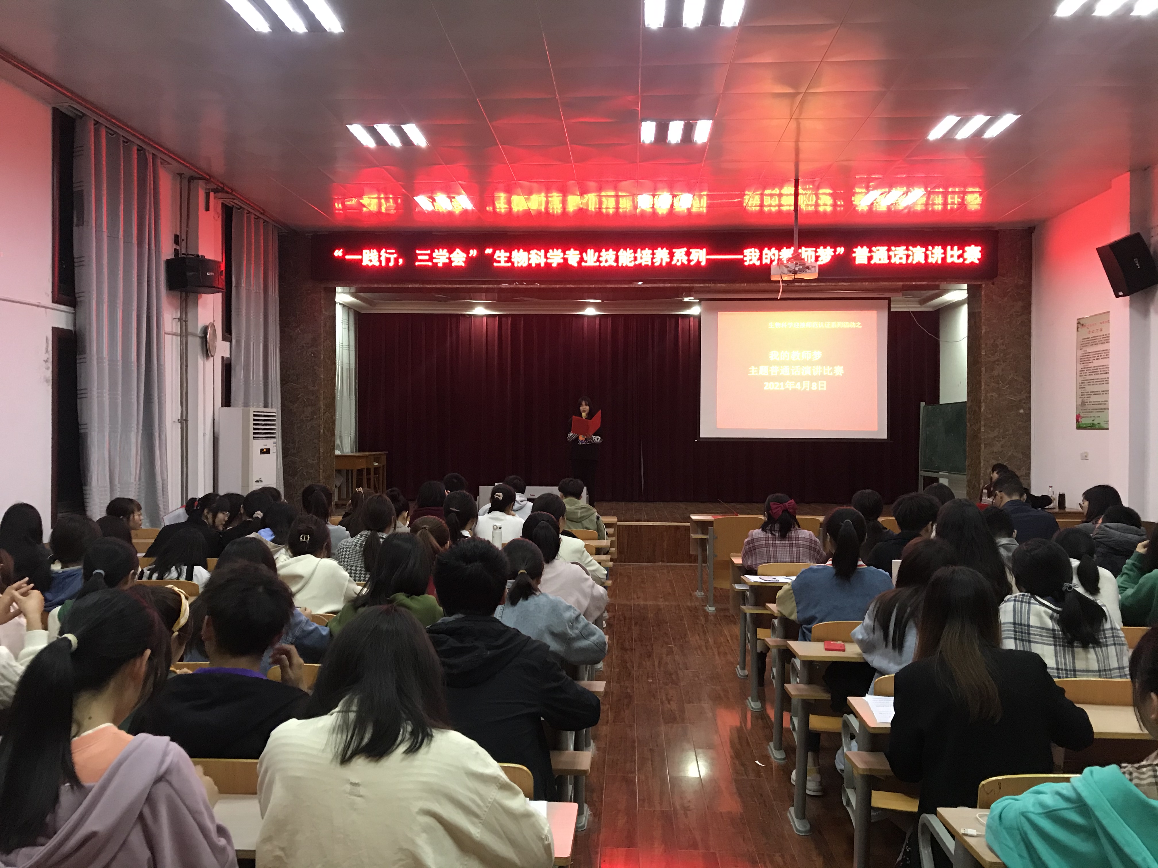 在主持人宣布了比赛规则和要求后,比赛正式拉开了序幕,生物科学专业2019、2020级共三十名学生参加了此场比赛。同学们激情澎湃,精神饱满,文字激昂。《教师梦、我的梦》、《我想站在三尺讲台之上》、《长大后我想成为你》等,标准的普通话,纯正的口音,同学们以自己的思想和经历,全方位地诠释了人民教师这一伟大的职业和自己心中的梦想。“教师梦想号,扬帆起航”,又一次把气氛推向高潮,赢得了评委和同学们阵阵掌声。
