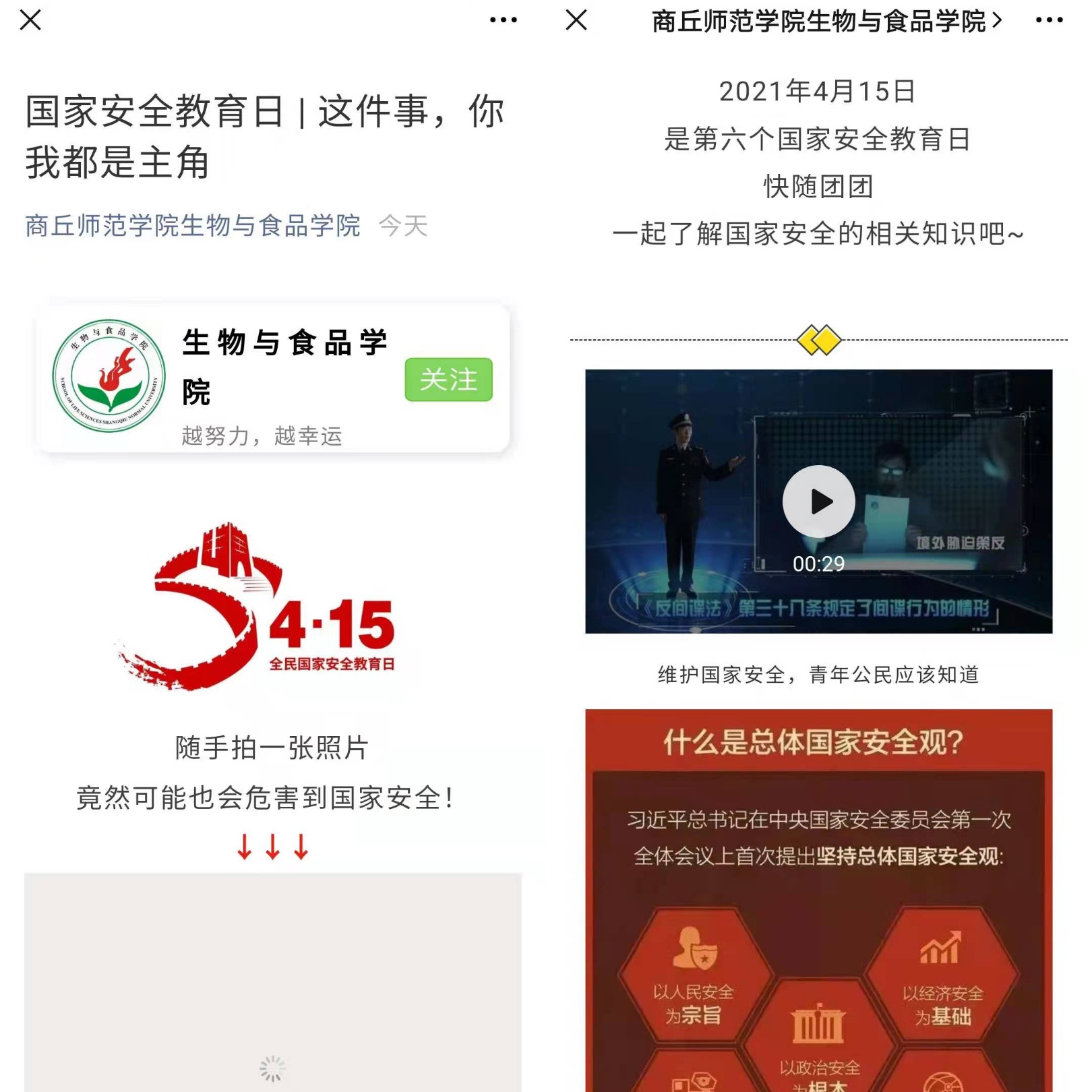 今天是第6个全民国家安全日,接到学校学生处通知,我院积极部署安排各年级辅导员组织学生开展形式多样灵活的“国家安全日”主题宣传教育活动。各年级辅导员进行了周密的安排并逐项落实活动策划,不仅组织学生灵活利用课间时间,在教室和宿舍多个地点观看国家安全日相关视频,浏览了相关网页新闻,还通过微信群、公众号、学习强国平台等有效途径开展此次活动,我院各年级学生均积极参与各项活动,使活动效果得到有效保证。