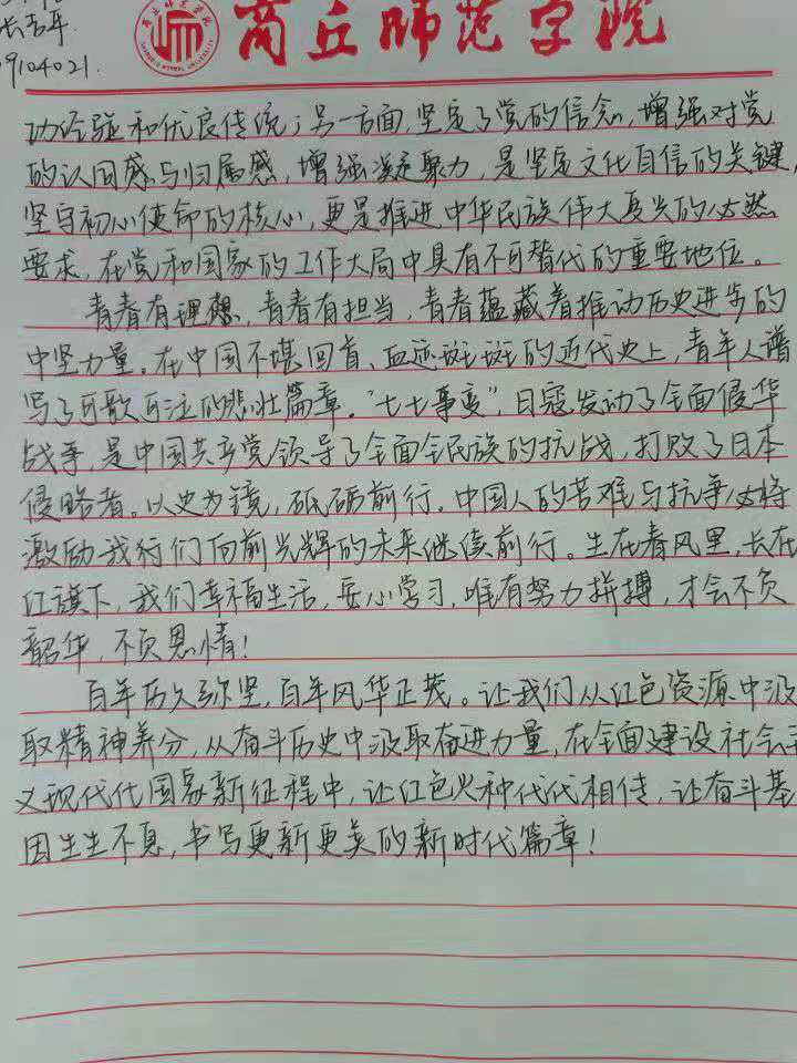 本次比赛圆满结束。本次征文比赛的成功举办不仅使我院学生了解了党的光辉历程,意识到了自身肩负的时代重任,同时也提高了同学们的写作水平,彰显出了同学们热爱生活、追求进步的精神风貌,营造了一个浓厚的学习氛围。
