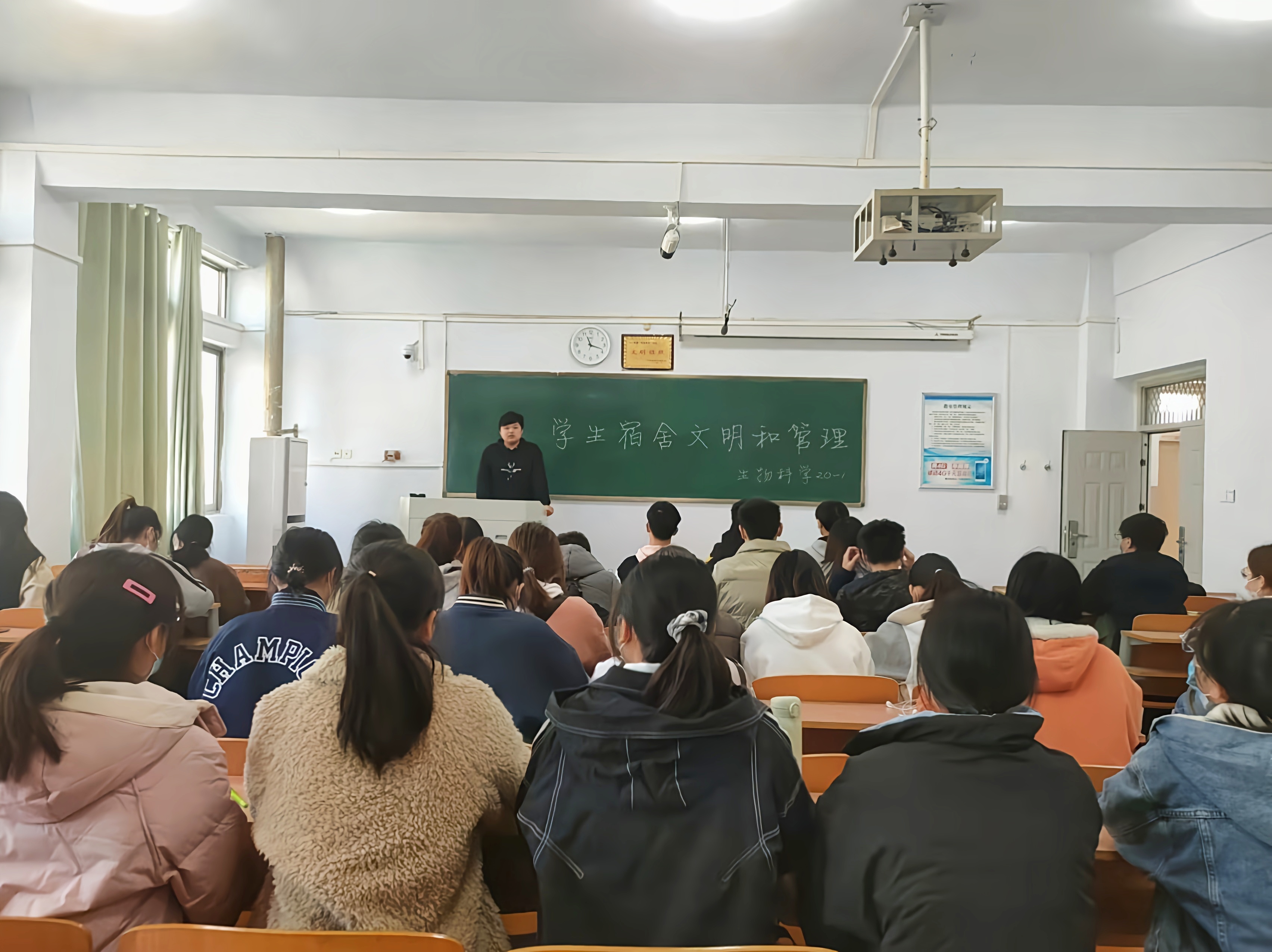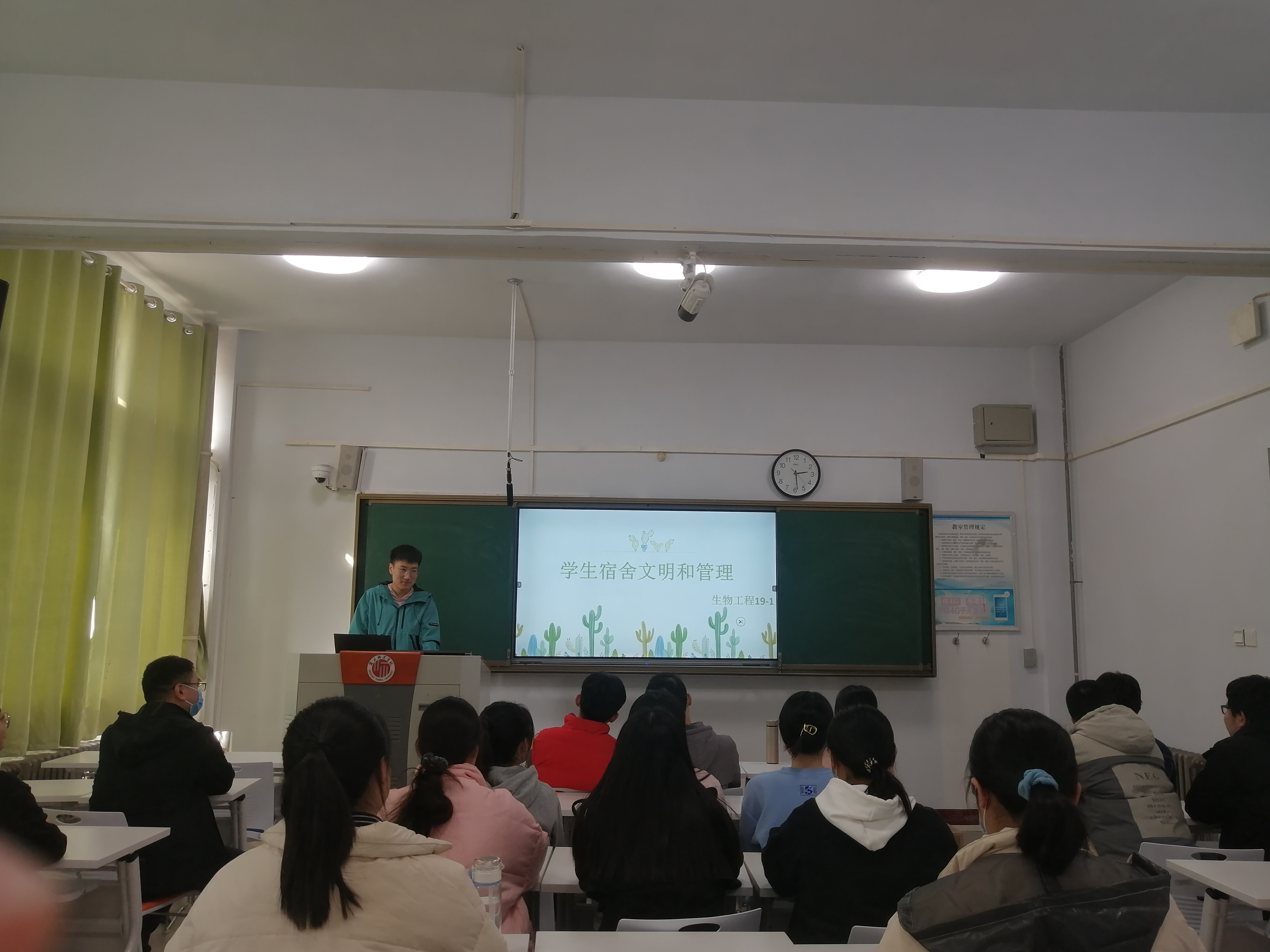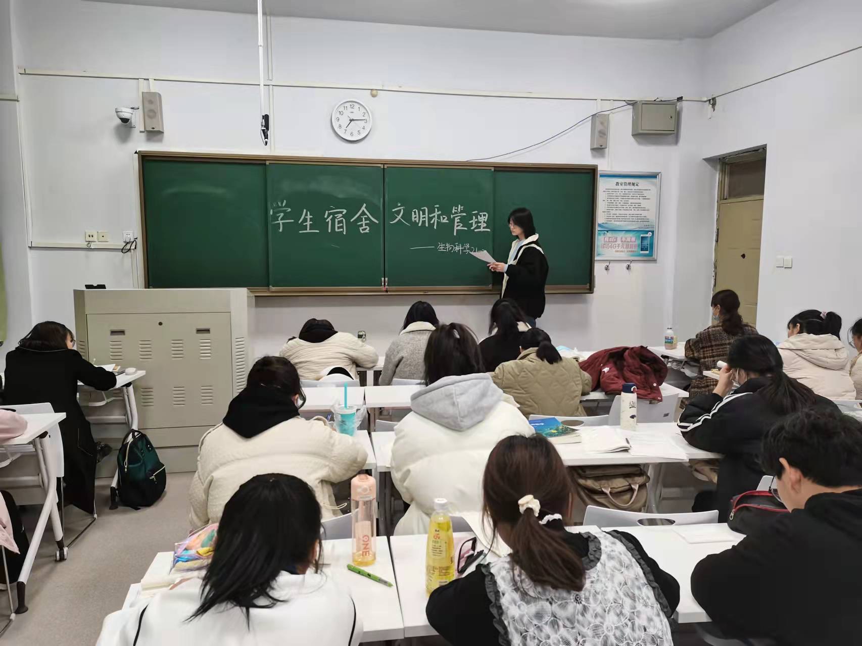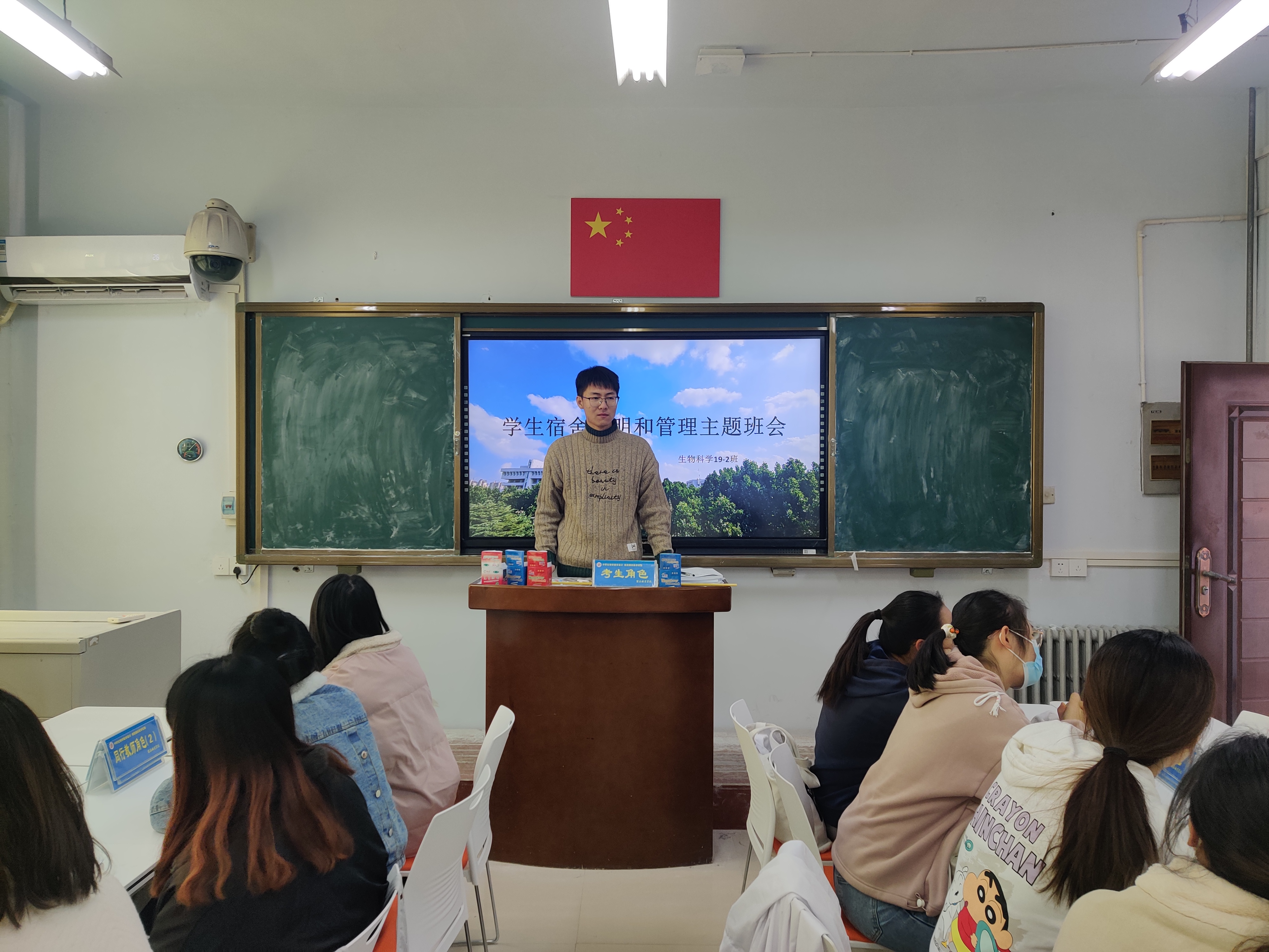 最后,各班班长就已发现的宿舍卫生和宿舍安全问题提出了解决方法,并再次强调宿舍卫生和宿舍安全的重要性和必要性。班会接近尾声,各班班长号召同学们行动起来,积极投身于建设文明安全宿舍,同学们也纷纷表示会为共建文明安全宿舍贡献出自己的一份力量。
