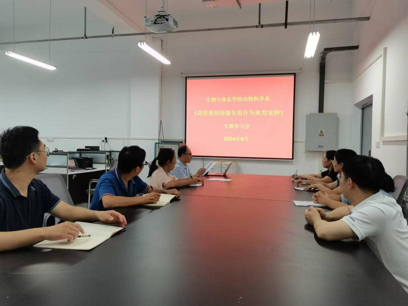 9月2日,动物科学系召开师德专题学习会,针对《高校教师师德师范行为典型案例》开展专项学习,会议由动物科学系系主任施传信副教授主持,专业全体教师参加会议。