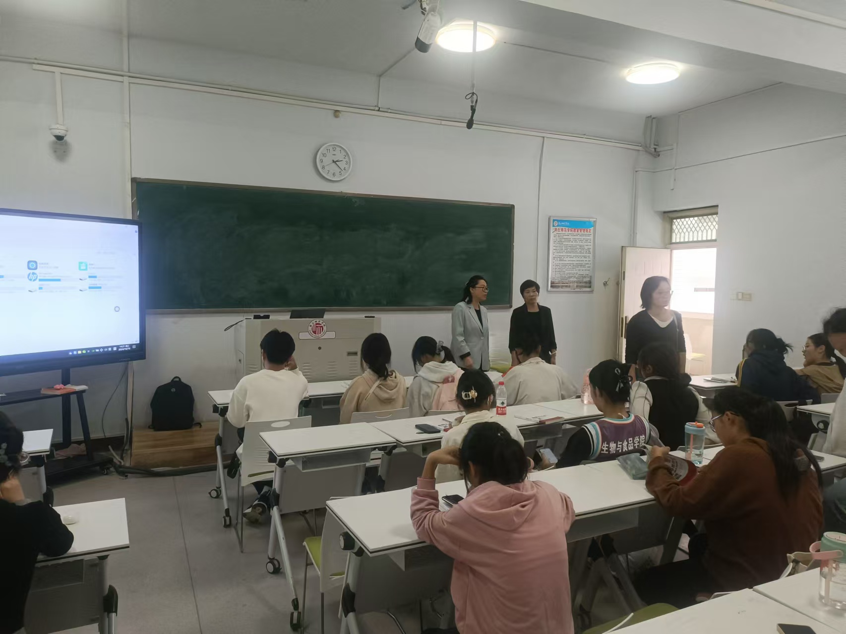 10月17日下午,院领导带领全体辅导员到一号教学楼深入课堂,现场督查学院学风建设工作,重点对教师授课情况、学生出勤情况、课堂教学秩序情况进行了检查。院长周庆峰对学院教学管理工作取得的成绩表示充分肯定,同时对个别课堂存在的问题予以督查,对相关人员提出整改要求。