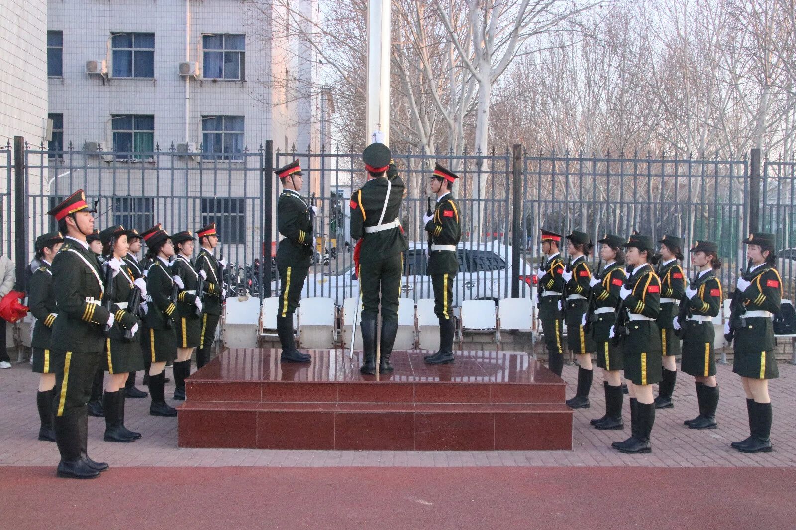 国旗护卫队迈着铿锵有力的步伐,护送鲜艳的五星红旗走向升旗台。伴随着雄壮的《义勇军进行曲》,全体师生肃立行注目礼,齐唱国歌,凝视国旗冉冉升起。