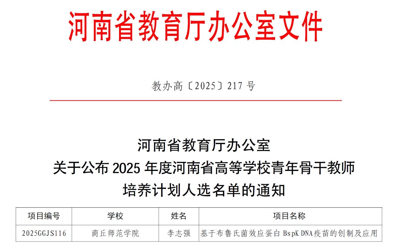 近日,河南省教育厅发布《关于公布2025年度河南省高等学校青年骨干教师培养计划人选名单的通知》(教办高〔2025〕217号),正式公布2025年度青年骨干教师培养计划人选名单。经教师申报、学院推荐、学校审核、教育厅审阅材料、组织专家评议及公示程序,我院李志强博士成功入选。