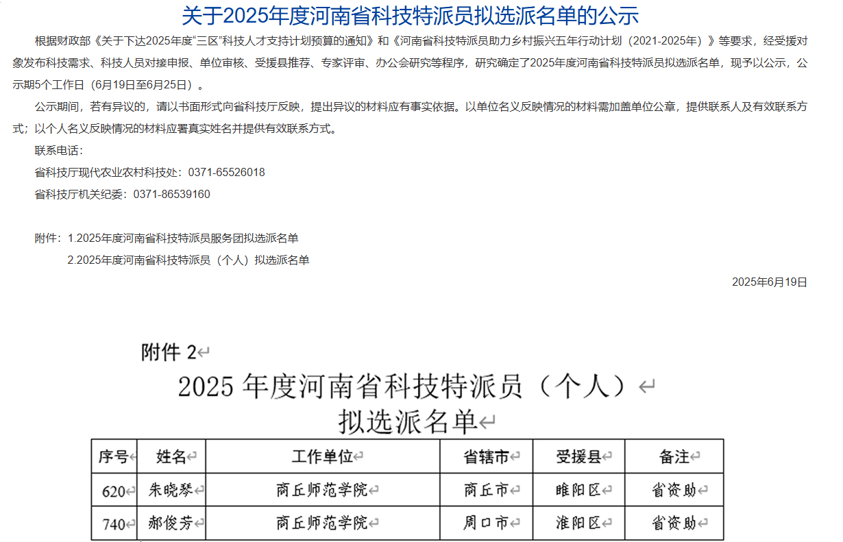 近日,河南省科学技术厅网站公布了《关于2025年度河南省科技特派员拟选派名单的公示》,我院朱晓琴和郝俊芳两位教师入选2025年度河南省科技特派员(个人)拟选派名单。