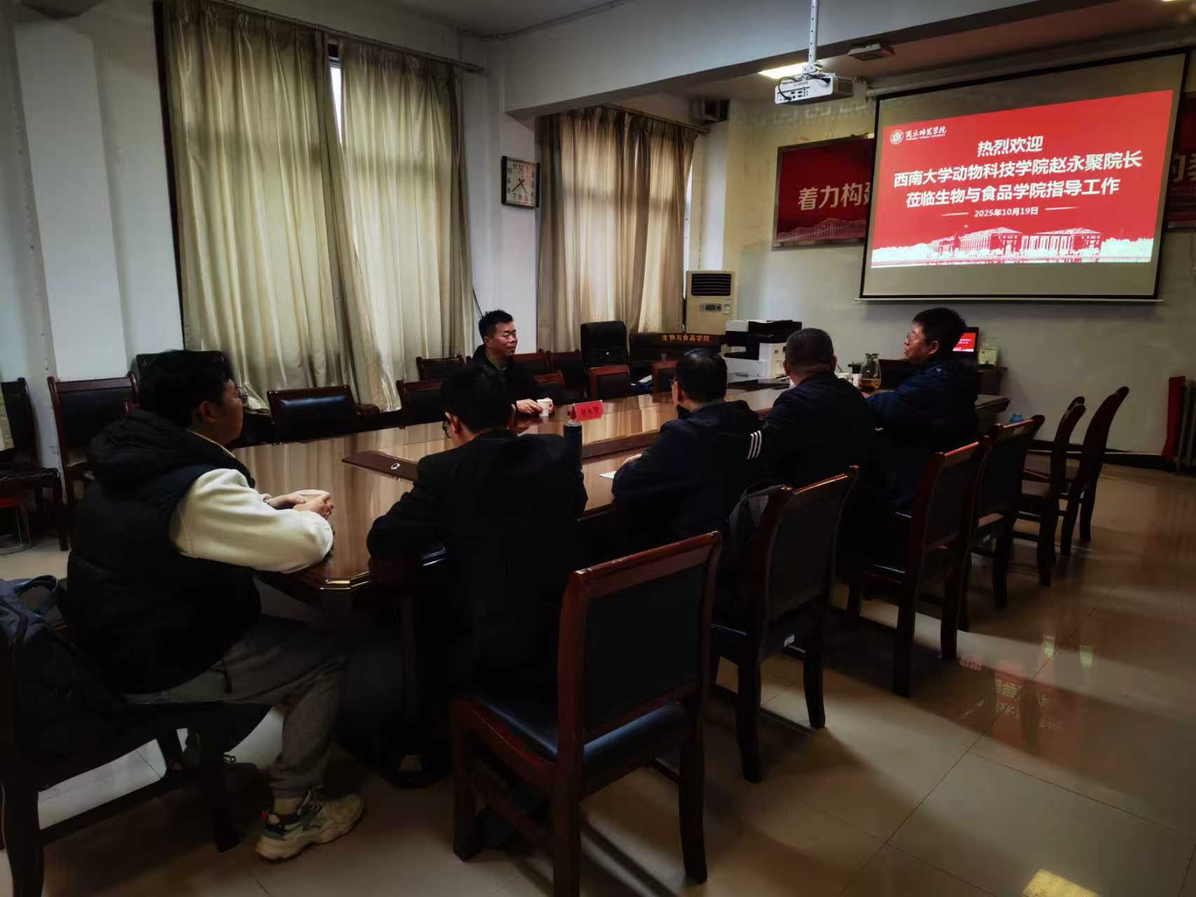 10月19日下午,西南大学动物科技学院院长赵永聚教授到我院座谈交流。williamhill中文副院长韩进诚、校地合作与服务中心副主任杨广礼、动物科学系主任施传信和动物科学专业部分老师参加座谈交流会。