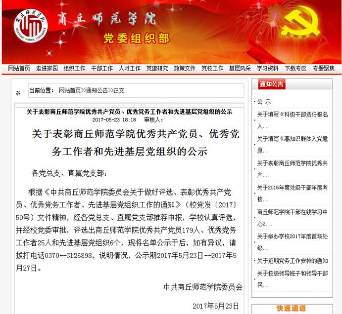 经过全院师生共同努力,我院全体党员发挥模范带头作用,积极探索教育教学改革和基层党建工作新模式、新方法,推动基层党建工作再上新台阶,取得了可喜的成绩。2017年5月23日,我校评选并公布了2017年度优秀共产党员、优秀党务工作者和先进基层党组织名单,我院党总支副书记史继红被评选为学校优秀党务工作者和全省高等学校优秀党务工作者,韩进诚、孟琛博、刘海滨、马原松、侯颖、张春梅、柏冰川(学生)等7名师生被评为2017年度优秀共产党员。