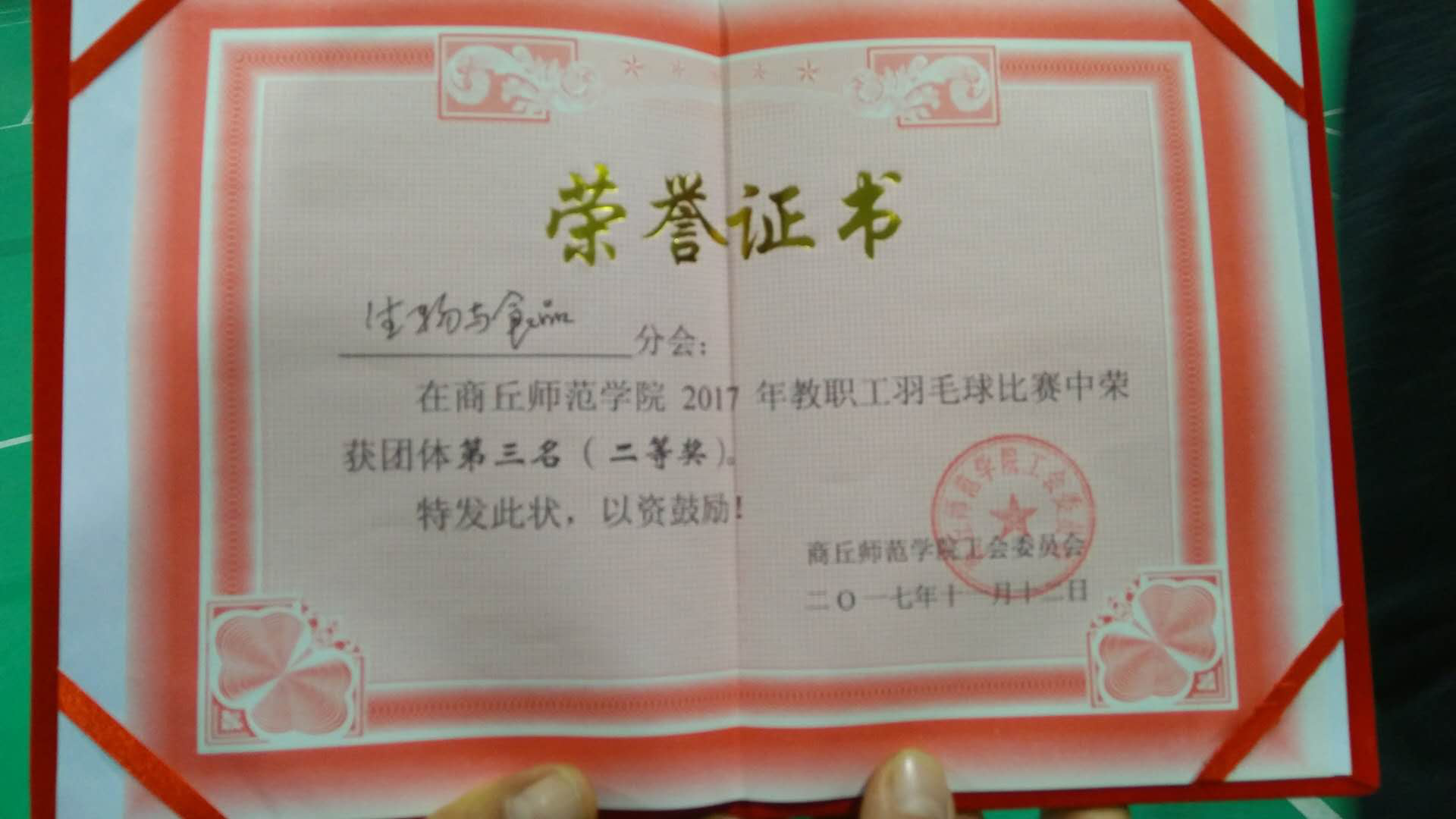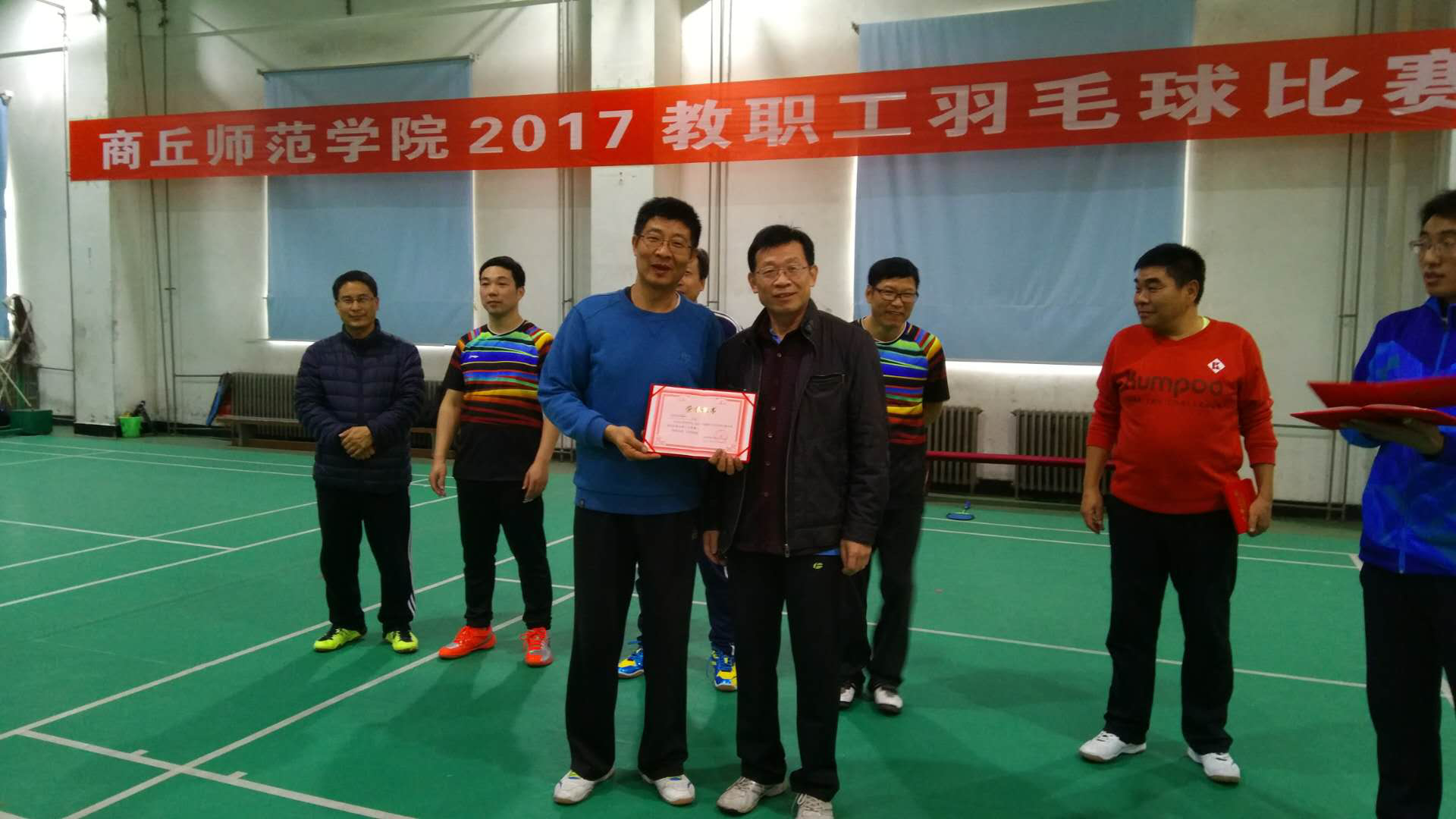 2017年11月11日-12日,我院教工羽毛球代表队参加了由校工会主办的2017年教职工羽毛球混合团体赛,最终,经过激烈角逐,我院教工代表队获得团体第三名的佳绩。我院历来注重丰富教职工业余生活,院工会分会每年通过开展各类丰富多彩的文体活动,提升教职工的精神面貌,增强教职工的身心素质,此次参赛,进一步提高了我院教职工羽毛球竞技水平,丰富了教职工的业余文化生活,同时以良好的精神风貌投入到我院各项工作中去,凝心聚力推动学院各项工作的发展。