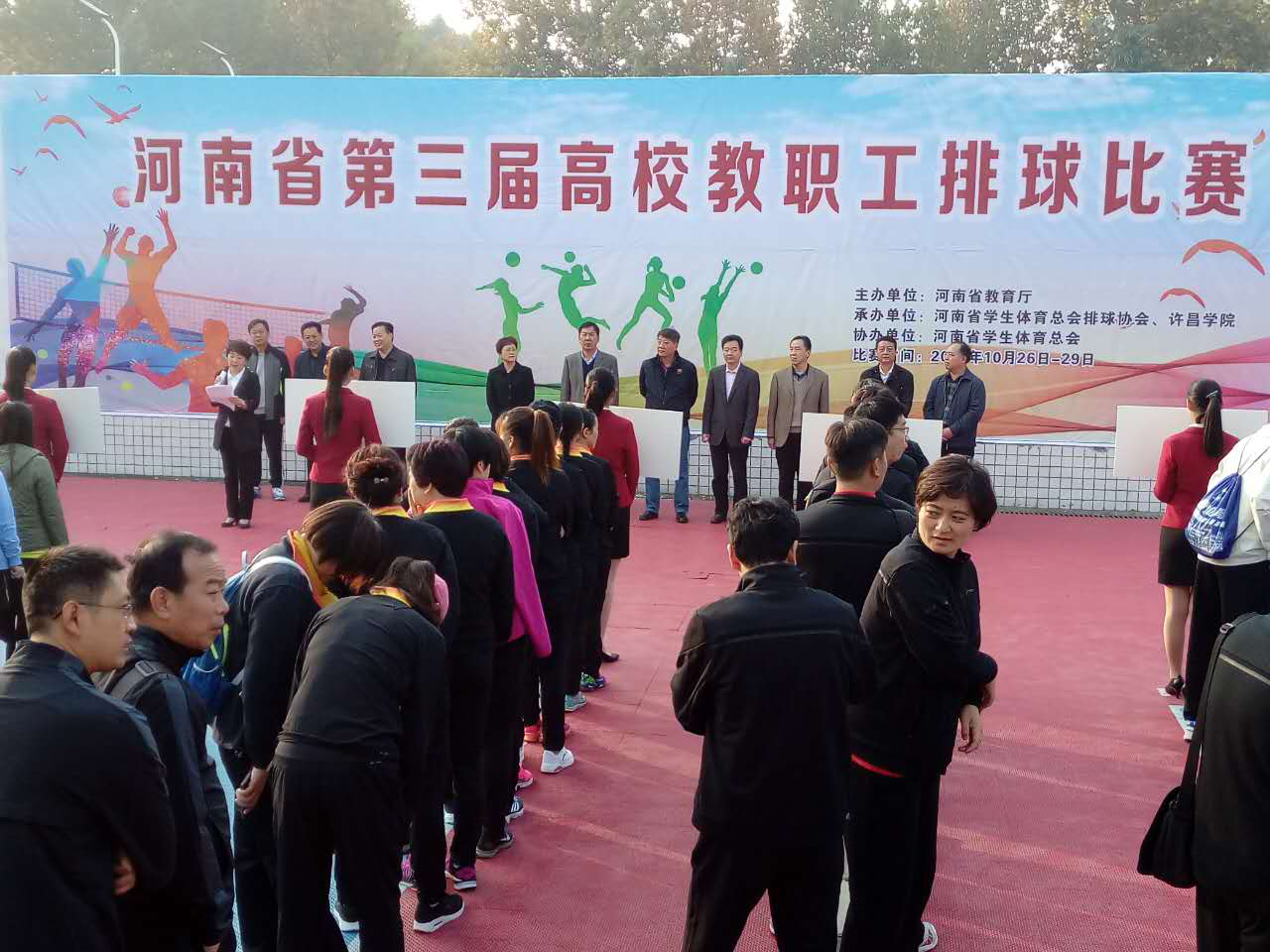 在校工会和排球俱乐部的共同努力下,10月26日至29日,我校职工参加了河南省第三届高校教职工排球赛在许昌学院举行。本次比赛,由河南省教育厅主办,河南省学生体育总会排球协会、许昌学院承办,共有来自全省31所高校的32支男子队伍和13支女子队伍参加了本次比赛。为参加此次比赛,我校工会对教职工排球队进行了认真选拔、集中训练和精心准备,组成了由体育学院院长肖丰任领队、工会副主席刘风亭任教练的男子排球队参加了男子组排球比赛并取得了优异成绩。