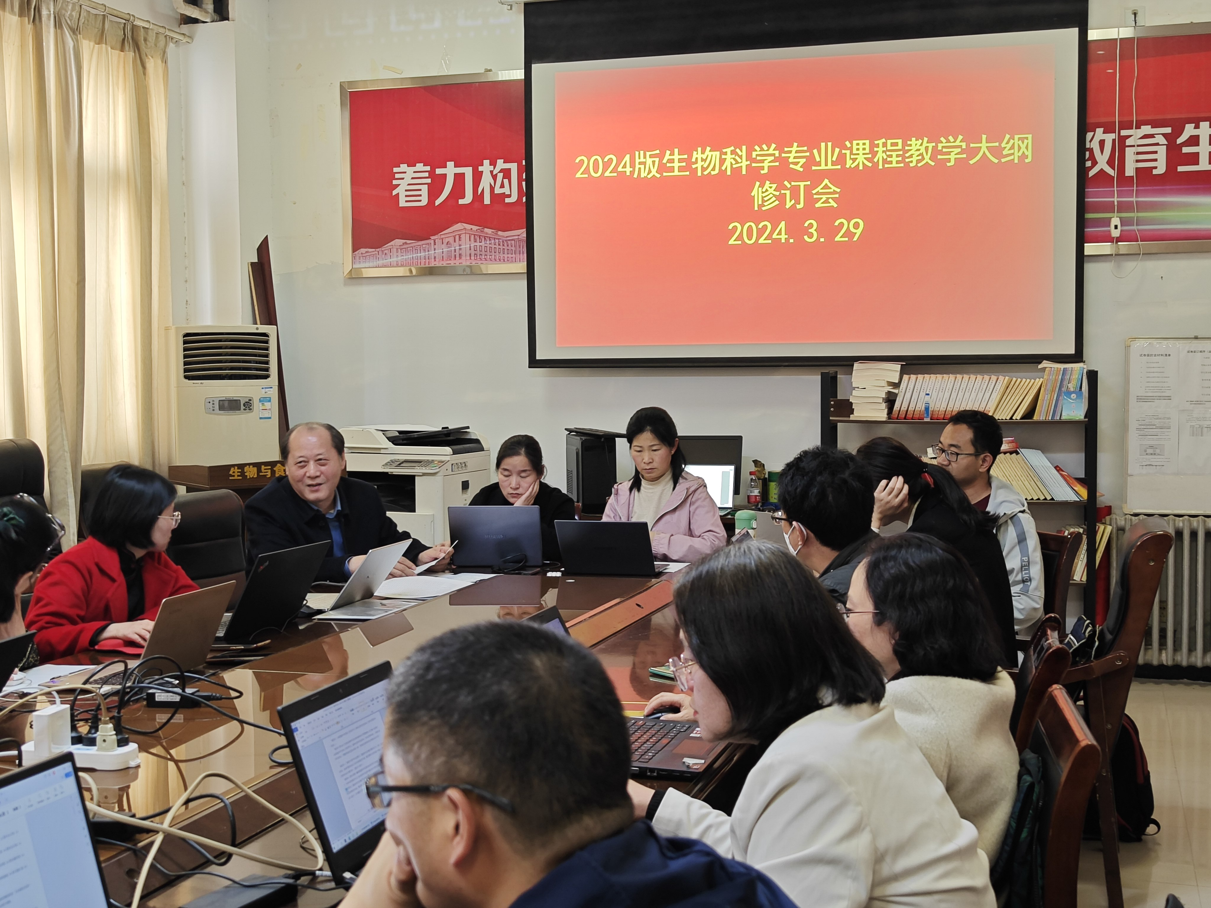 2024年3月29日下午,生物科学专业在院会议室召开了2024版生物科学专业课程教学大纲修订会。会议由生物科学系主任郑爱珍主持,刘福林教授主讲,全系教师参加了修订会。