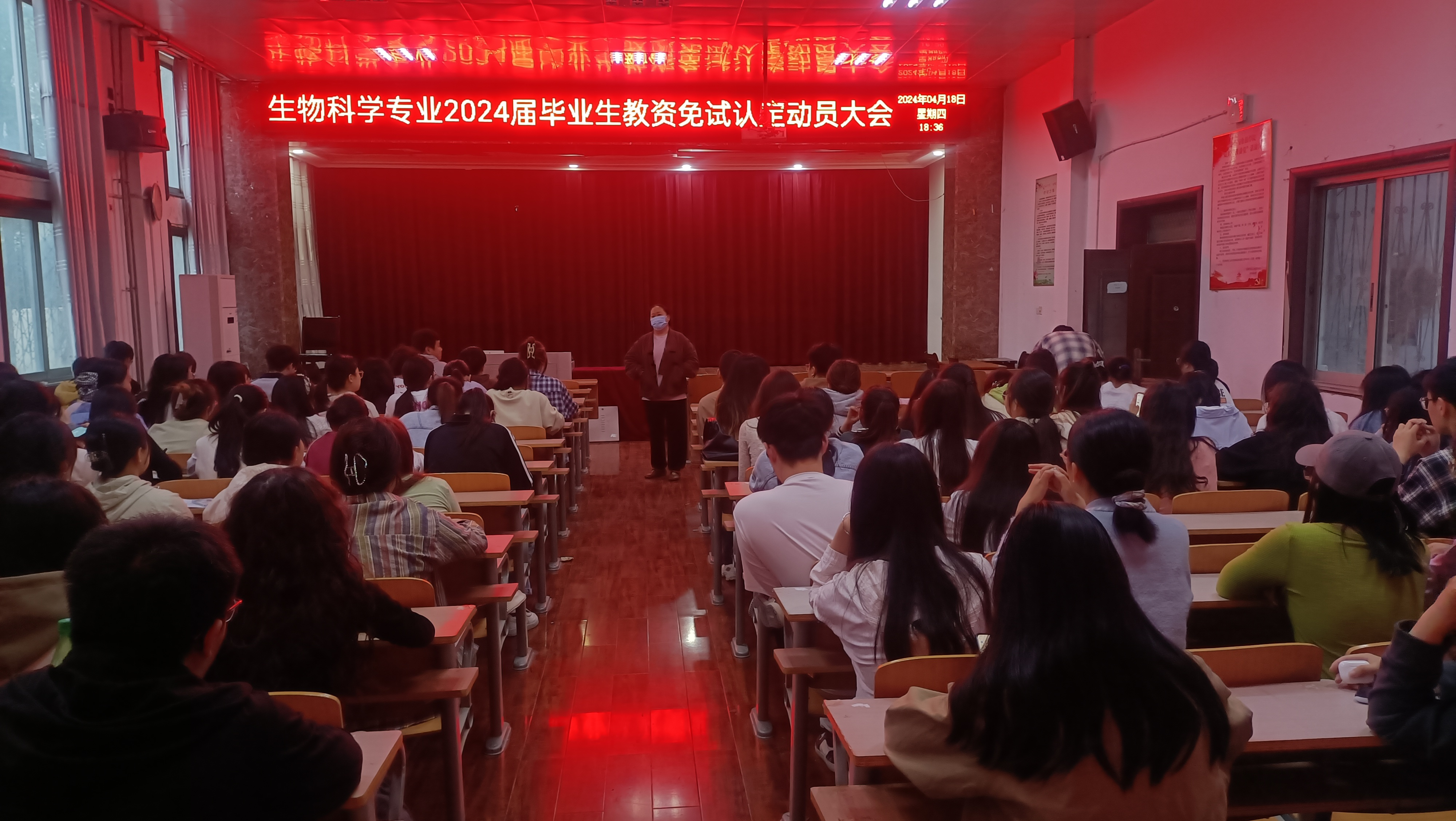 2024年4月18日晚,生物科学专业在院报告厅召开了2024届毕业生教资免试认定动员大会。会议由生物科学系主任郑爱珍主持,刘福林教授主讲,生物科学专业2024届全体毕业生参加了会议。