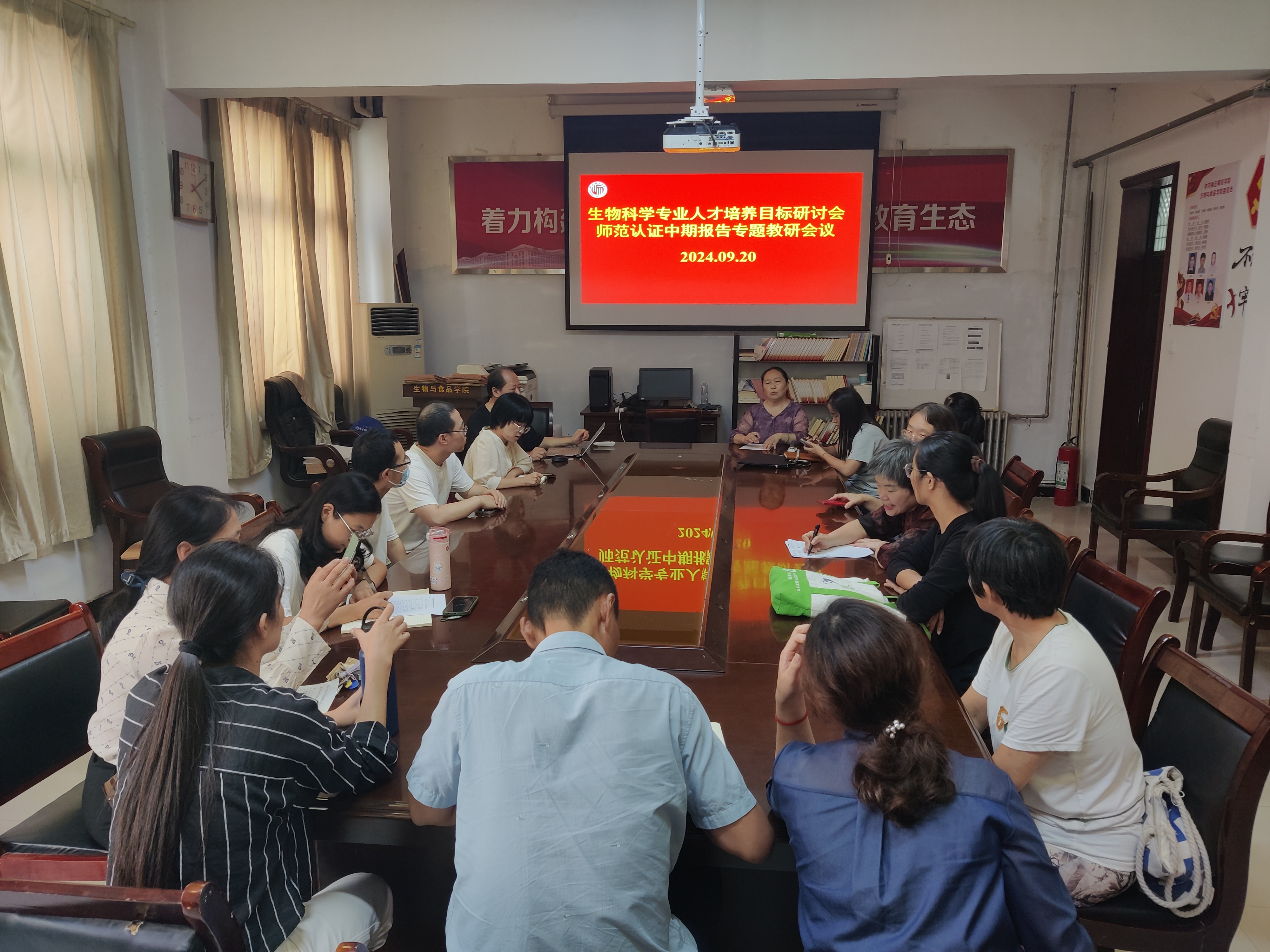为了深化师范专业认证中期成果,生物科学专业于2024年9月20日在院会议室召开了生物科学专业人才培养目标专题教研会议。生物科学专业全体教师参加了研讨会,系主任郑爱珍主持会议,专业带头人、省级教学名师刘福林教授主讲。
