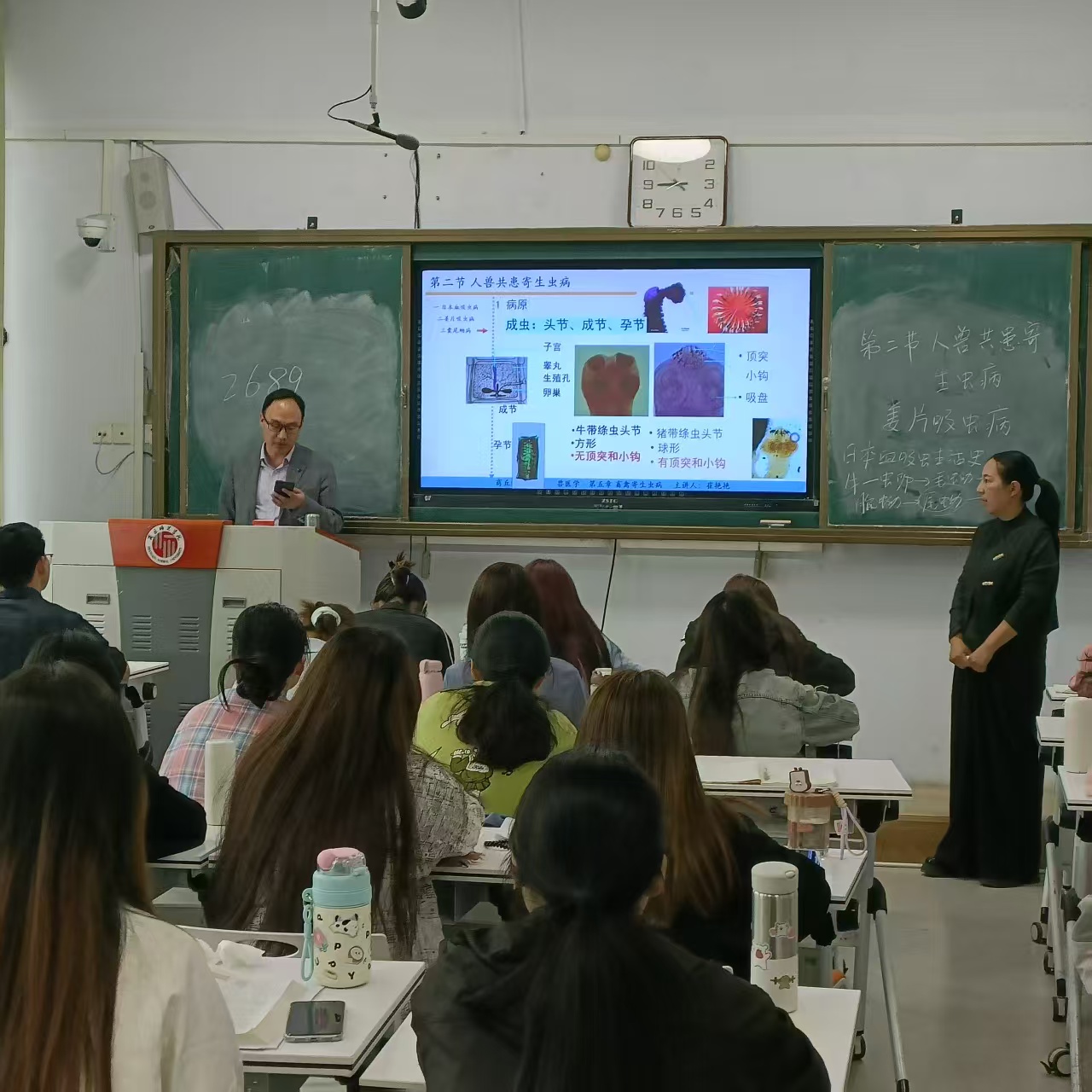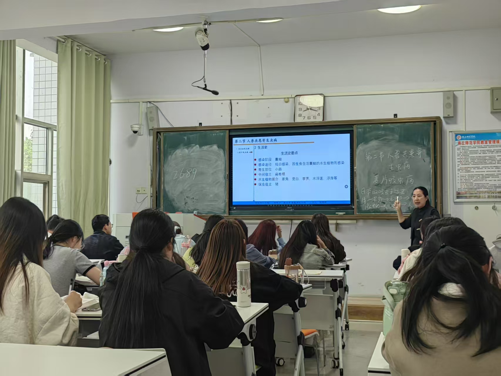 在讲述“姜片吸虫病的防治”时,崔艳艳老师用临床案例,讲述人感染姜片吸虫病的主要途径是食用水生植物荸荠,菱角等,严格杜绝“病从口入”。采用主题讨论等方式,通过巧妙的设问和解答,既加深了学生对姜片吸虫病病原特点及生活史的理解,又强化了学生的食品安全意识。