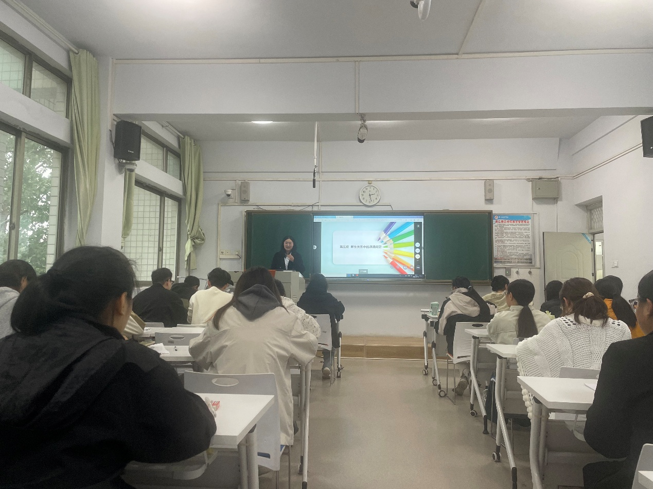 课堂上,刘老师以“四颗糖”的教育故事导入,引导学生思考师生互动中蕴含的道德智慧。课程围绕“师生关系概述、师生间的教学关系与师生间的情感关系”三大板块,系统阐释师生关系的本质与意义,层层推进,逻辑清晰。