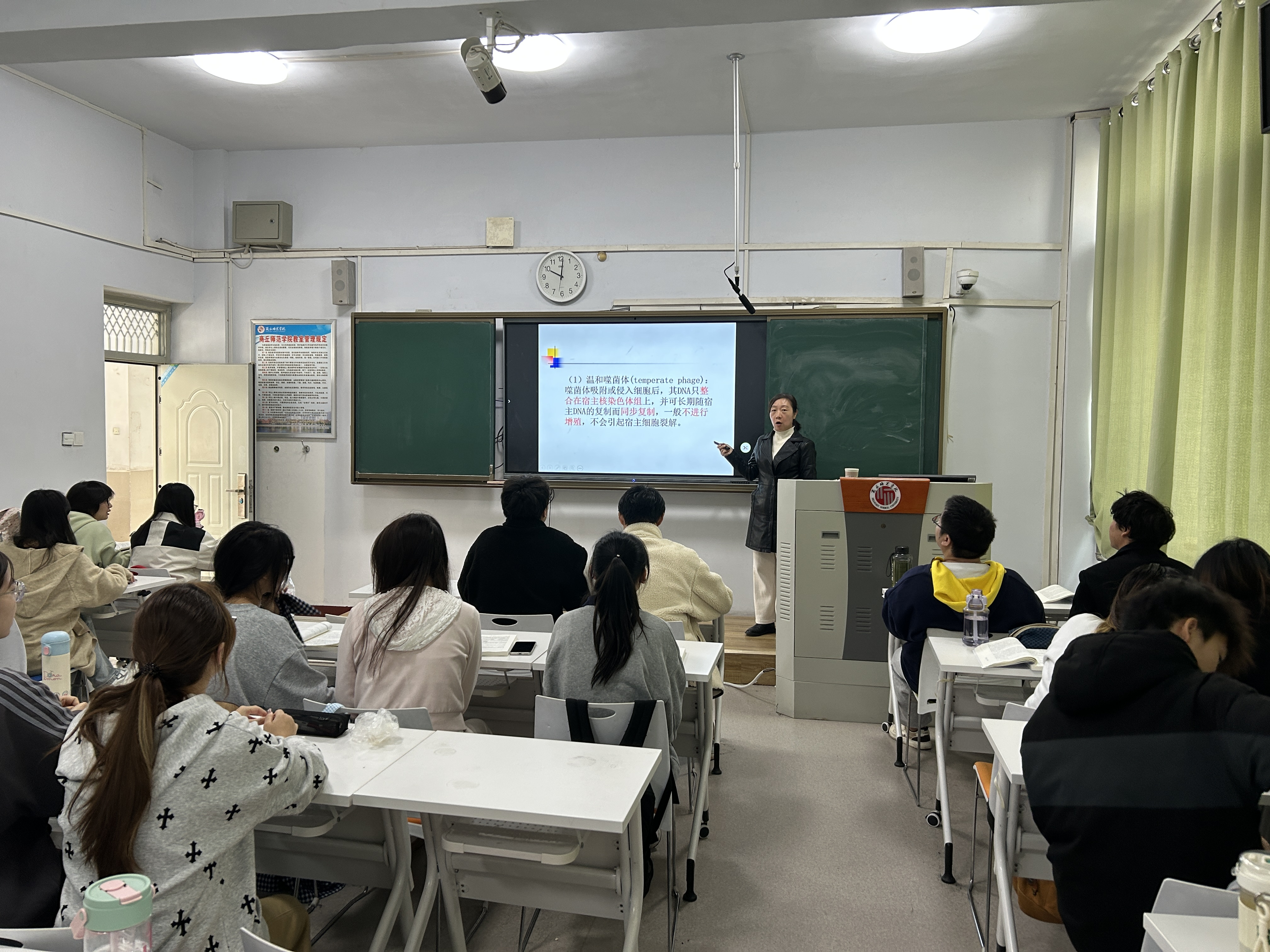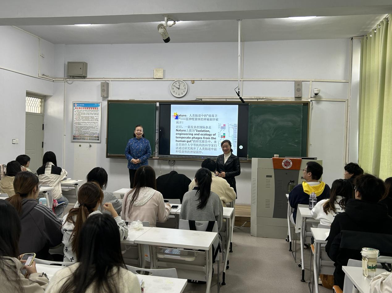 课堂上,张老师以“温和噬菌体”为主题,开展了一堂富有深度与前瞻性的教学展示。她以《Nature》期刊2025年10月25日发表的最新研究成果为切入点,系统解析了温和噬菌体的研究路径与技术框架,引导学生从实验设计、方法比较到创新路径进行层层思考。在授课过程中,张老师不仅注重理论知识的传授,更注重科研思维的培养,通过设置“研究缺口识别—实验条件构建—创新点提炼”三个教学环节,帮助学生建立从知识接受到能力迁移的学习闭环,有效提升了学生在微生物前沿领域的认知层次与探究能力。