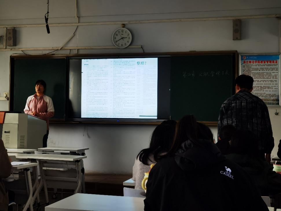 本次公开课以“文献管理工具EndNote使用”为主题,教学过程按照“知识回顾—新课导入—讲授—学生动手操作—总结—布置作业”六个环节依次展开。课程开始,李雪杰老师带领学生复习上节课所学内容,系统总结了中英文论文检索常用数据库,指出获取文献的途径具有多样性。随后,通过提问方式引导学生思考:“如何将检索到的文献规范地插入到论文中?”以此自然导入新课。在讲授环节,李老师重点讲解了EndNote的安装方法、文献导入、文献管理及其在论文写作中的具体应用。之后组织学生进行现场操作演示,并针对操作中出现的问题逐一解答,帮助学生加深对EndNote软件的理解与使用能力。